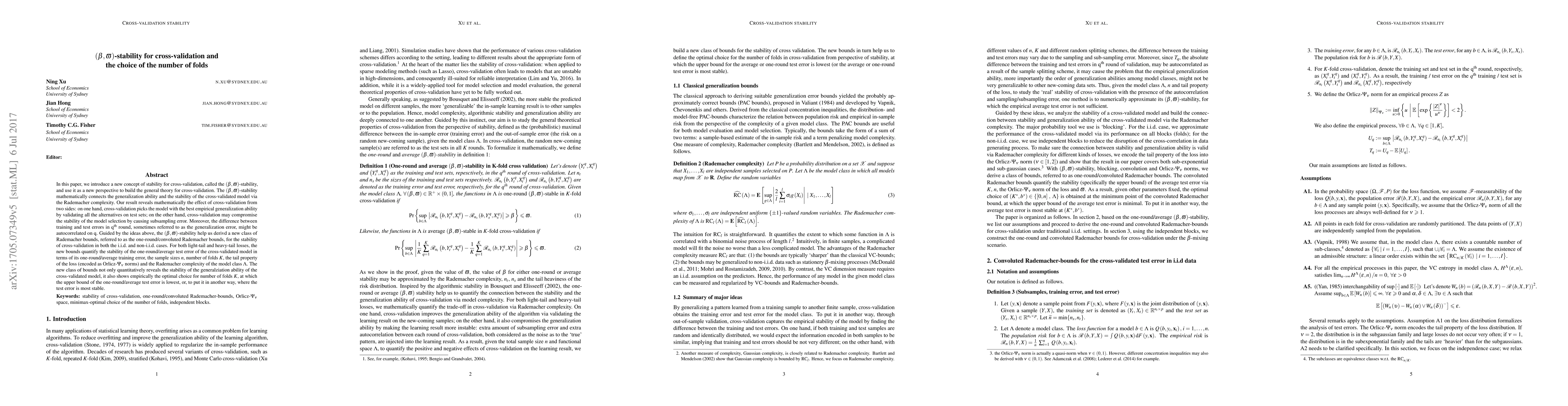 In this paper, we introduce a new concept of stability for cross-validation, called the $\left( \beta, \varpi \right)$-stability, and use it as a new perspective to build the general theory for cross-validation. The $\left( \beta, \varpi \right)$-stability mathematically connects the generalization ability and the stability of the cross-validated model via the Rademacher complexity. Our result reveals mathematically the effect of cross-validation from two sides: on one hand, cross-validation picks the model with the best empirical generalization ability by validating all the alternatives on test sets; on the other hand, cross-validation may compromise the stability of the model selection by causing subsampling error. Moreover, the difference between training and test errors in q\textsuperscript{th} round, sometimes referred to as the generalization error, might be autocorrelated on q. Guided by the ideas above, the $\left( \beta, \varpi \right)$-stability help us derivd a new class of Rademacher bounds, referred to as the one-round/convoluted Rademacher bounds, for the stability of cross-validation in both the i.i.d.\ and non-i.i.d.\ cases. For both light-tail and heavy-tail losses, the new bounds quantify the stability of the one-round/average test error of the cross-validated model in terms of its one-round/average training error, the sample sizes $n$, number of folds $K$, the tail property of the loss (encoded as Orlicz-$\Psi_\nu$ norms) and the Rademacher complexity of the model class $\Lambda$. The new class of bounds not only quantitatively reveals the stability of the generalization ability of the cross-validated model, it also shows empirically the optimal choice for number of folds $K$, at which the upper bound of the one-round/average test error is lowest, or, to put it in another way, where the test error is most stable.
