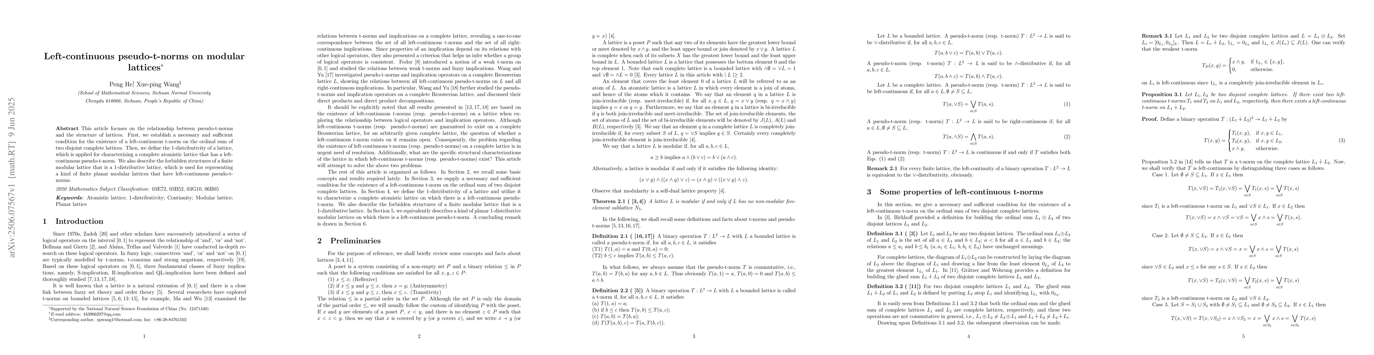 This article focuses on the relationship between pseudo-t-norms and the structure of lattices. First, we establish a necessary and sufficient condition for the existence of a left-continuous t-norm on the ordinal sum of two disjoint complete lattices. Then, we define the $1$-distributivity of a lattice, which is applied for characterizing a complete atomistic lattice that has a left-continuous pseudo-t-norm. We also describe the forbidden structures of a finite modular lattice that is a $1$-distributive lattice, which is used for representing a kind of finite planar modular lattices that have left-continuous pseudo-t-norms.