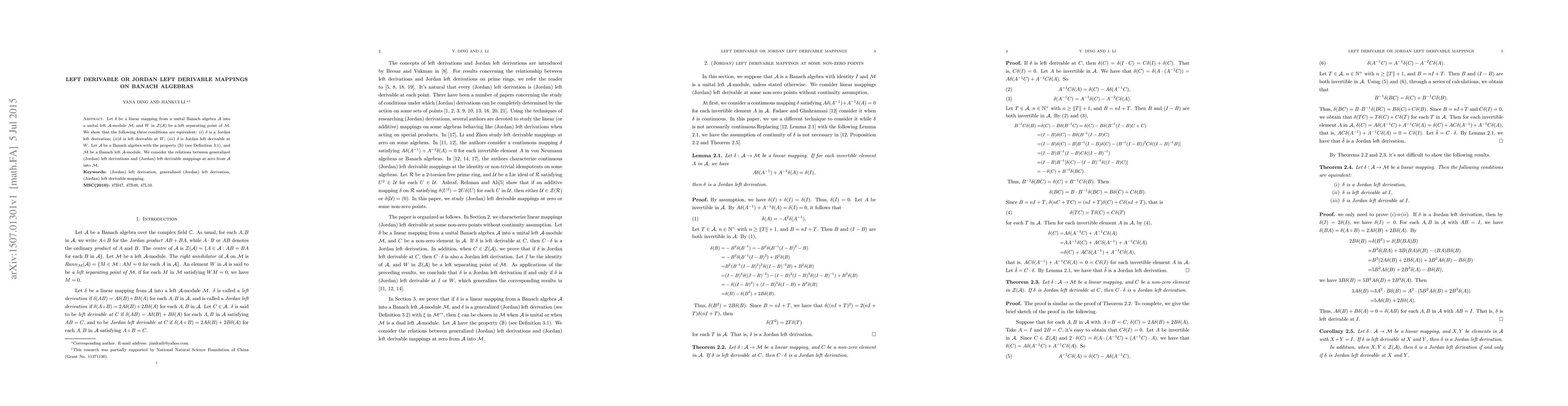 Let d be a linear mapping from a unital Banach algebra A into a unital left A-module M, and w in Z(A) be a left separating point of M. We show that the following three conditions are equivalent: (i) d is a Jordan left derivation; (ii) d is left derivable at w; (iii) d is Jordan left derivable at w. Let A be a Banach algebra with the property (B), and M be a Banach left A-module. We consider the relations between generalized (Jordan) left derivations and (Jordan) left derivable mappings at zero from A into M.