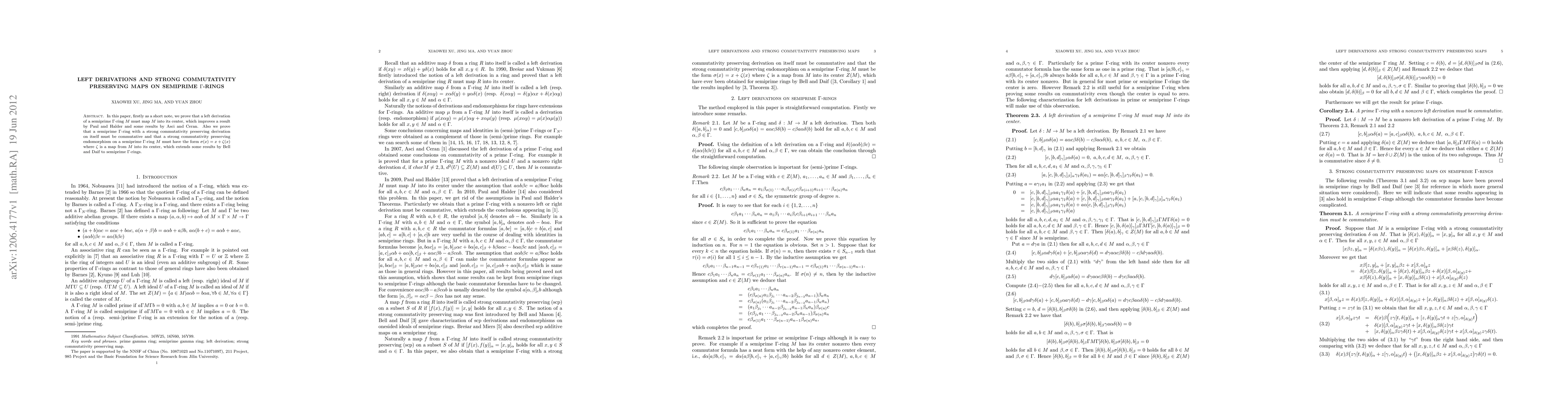In this paper, firstly as a short note, we prove that a left derivation of a semiprime $\Gamma$-ring $M$ must map $M$ into its center, which improves a result by Paul and Halder and some results by Asci and Ceran. Also we prove that a semiprime $\Gamma$-ring with a strong commutativity preserving derivation on itself must be commutative and that a strong commutativity preserving endomorphism on a semiprime $\Gamma$-ring $M$ must have the form $\sigma(x)=x+\zeta(x)$ where $\zeta$ is a map from $M$ into its center, which extends some results by Bell and Daif to semiprime $\Gamma$-rings.