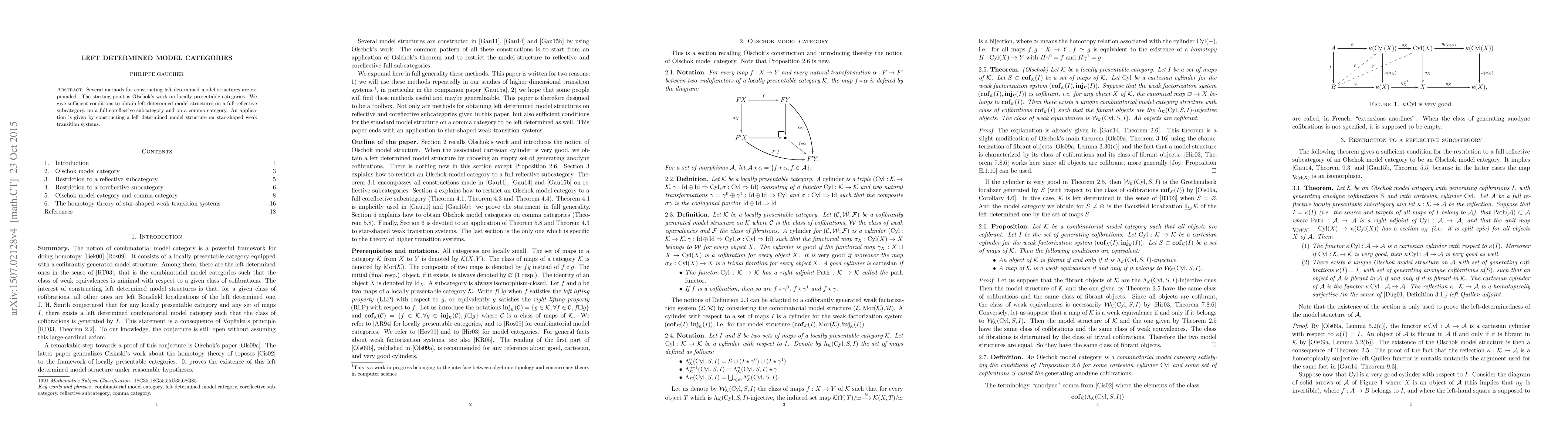 This paper presents methods for constructing left determined model structures on various subcategories of category theory, with applications to weak transition systems.