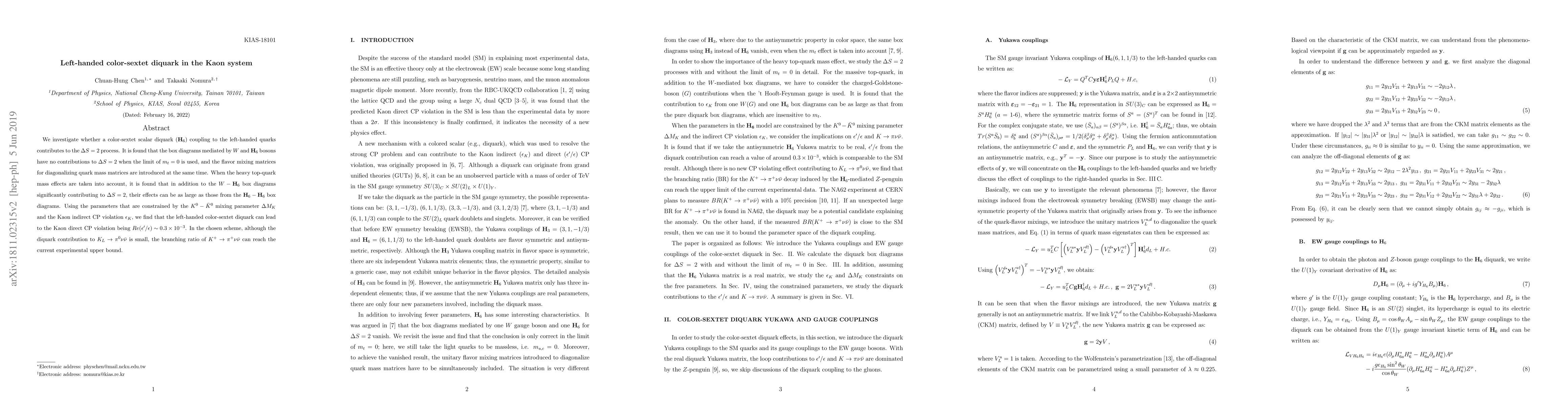 We investigate whether a color-sextet scalar diquark (${\bf H}_6$) coupling to the left-handed quarks contributes to the $\Delta S=2$ process. It is found that the box diagrams mediated by $W$ and ${\bf H}_6$ bosons have no contributions to $\Delta S=2$ when the limit of $m_t=0$ is used, and the flavor mixing matrices for diagonalizing quark mass matrices are introduced at the same time. When the heavy top-quark mass effects are taken into account, it is found that in addition to the $W-{\bf H}_6$ box diagrams significantly contributing to $\Delta S=2$, their effects can be as large as those from the ${\bf H}_6-{\bf H}_6$ box diagrams. Using the parameters that are constrained by the $K^0-\bar K^0$ mixing parameter $\Delta M_K$ and the Kaon indirect CP violation $\epsilon_K$, we find that the left-handed color-sextet diquark can lead to the Kaon direct CP violation being $Re(\epsilon'/\epsilon) \sim 0.4 \times 10^{-3}$. In the chosen scheme, although the diquark contribution to $K_L\to \pi^0 \nu \bar\nu$ is small, the branching ratio of $K^+ \to \pi^+ \nu \bar\nu$ can reach the current experimental upper bound.