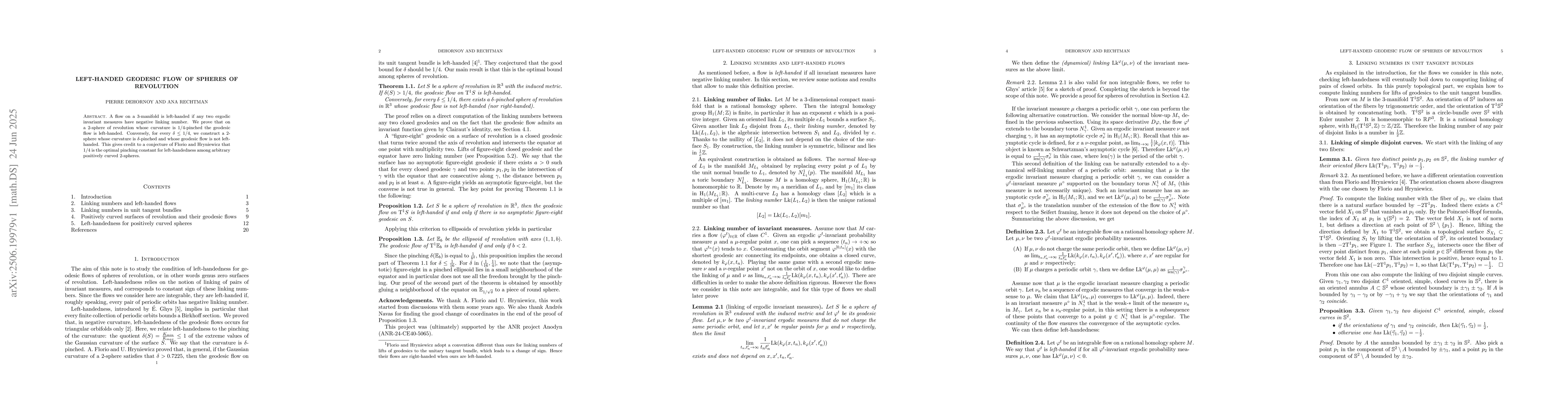 A flow on a 3-manifold is left-handed if any two ergodic invariant measures have negative linking number. We prove that on a 2-sphere of revolution whose curvature is $1/4$-pinched the geodesic flow is left-handed. Conversely, for every $\delta\le 1/4$, we construct a 2-sphere whose curvature is $\delta$-pinched and whose geodesic flow is not left-handed. This gives credit to a conjecture of Florio and Hryniewicz that $1/4$ is the optimal pinching constant for left-handedness among arbitrary positively curved 2-spheres.