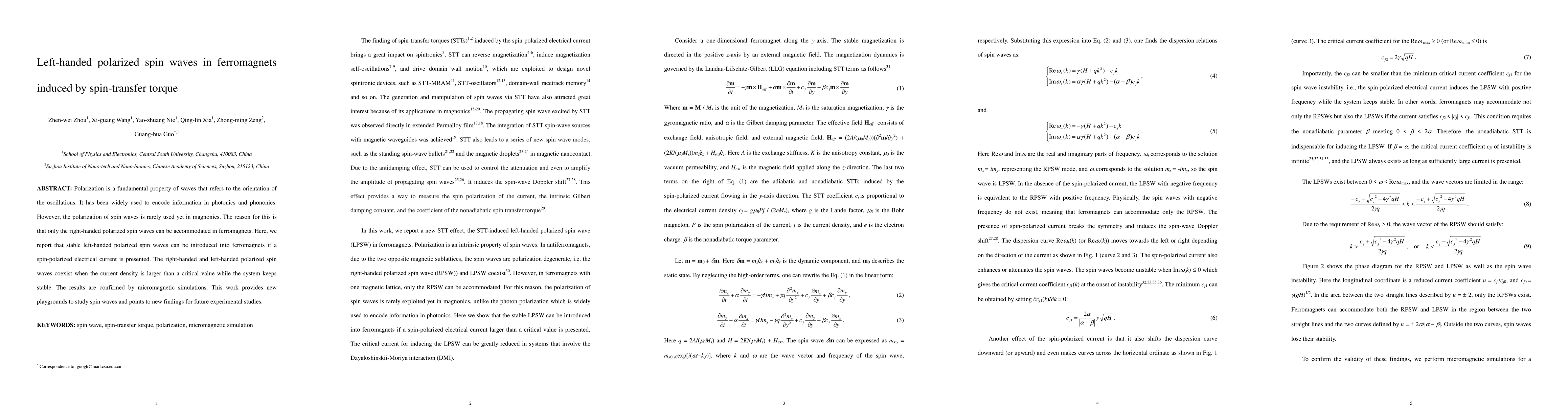 This paper reports the induction of stable left-handed polarized spin waves in ferromagnets via spin-transfer torque from a spin-polarized electrical current, a phenomenon previously limited to right-handed waves. The study confirms the coexistence of both polarizations above a critical current density through micromagnetic simulations.