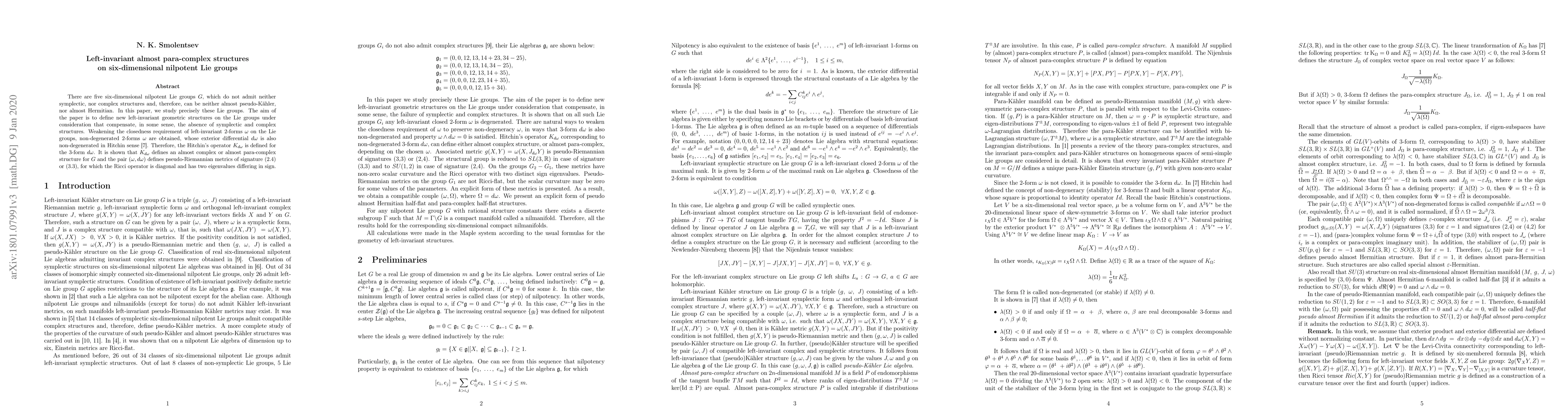 There are five six-dimensional nilpotent Lie groups G, which do not admit neither symplectic, nor complex structures and, therefore, can be neither almost pseudo-Kahler, nor almost Hermitian. In this work, these Lie groups are being studied. The aim of the paper is to define new left-invariant geometric structures on the Lie groups under consideration that compensate, in some sense, the absence of symplectic and complex structures. New examples of multiparametric families of metrics of signature (3,3) and almost para-complex pseudo-Riemannian half-flat structures on six-dimensional nilmanifolds are obtained. These metrics have a diagonal Ricci operator with two eigenvalues, which differ only in sign.