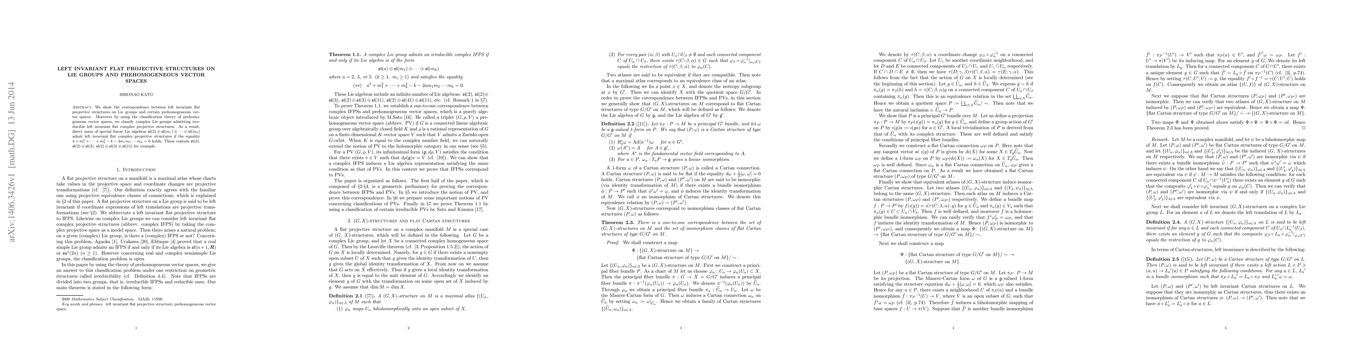The paper presents a novel method of classifying complex Lie groups using prehomogeneous vector spaces, specifically focusing on left invariant flat projective structures.