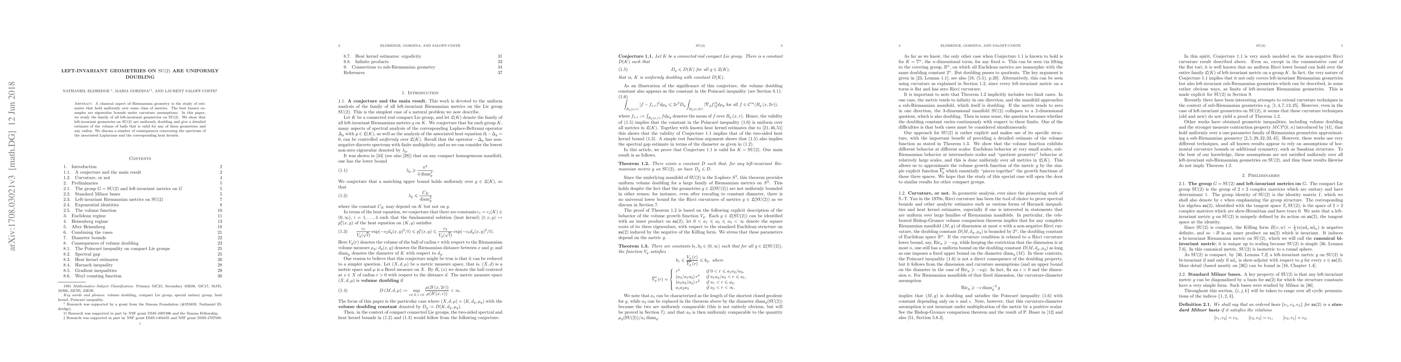 A classical aspect of Riemannian geometry is the study of estimates that hold uniformly over some class of metrics. The best known examples are eigenvalue bounds under curvature assumptions. In this paper, we study the family of all left-invariant geometries on $\mathrm{SU}(2)$. We show that left-invariant geometries on $\mathrm{SU}(2)$ are uniformly doubling and give a detailed estimate of the volume of balls that is valid for any of these geometries and any radius. We discuss a number of consequences concerning the spectrum of the associated Laplacians and the corresponding heat kernels.