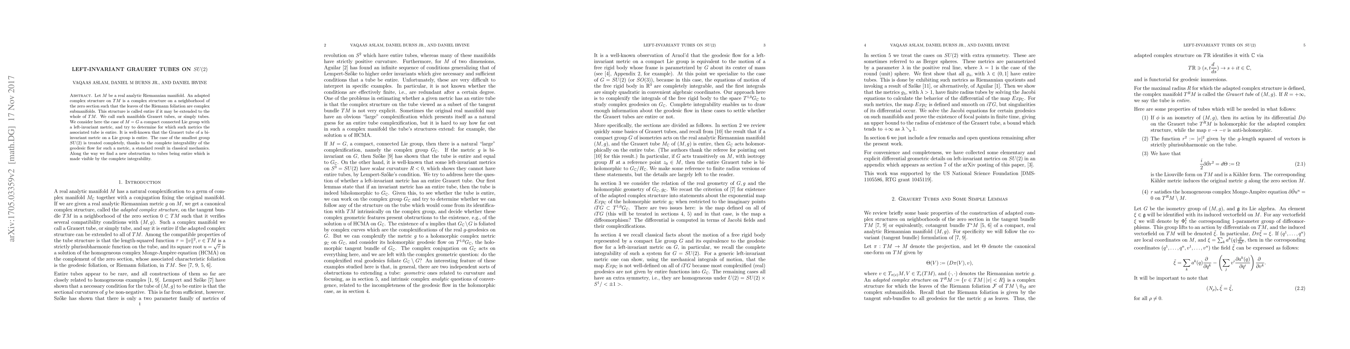 This paper investigates left-invariant metrics on the compact Lie group SU(2) and determines conditions for the associated Grauert tubes to be entire. It reveals a new obstruction to the entireness of these tubes, leveraging the complete integrability of the geodesic flow on SU(2).