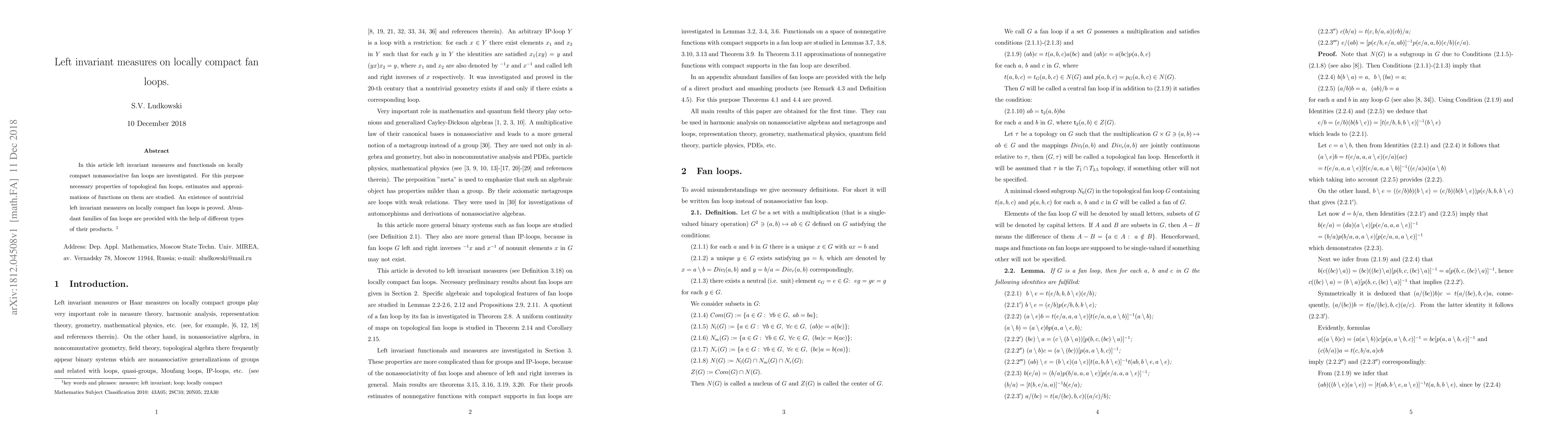 Researchers investigated left invariant measures on locally compact fan loops, proving their existence and providing abundant families of fan loops with specific products.