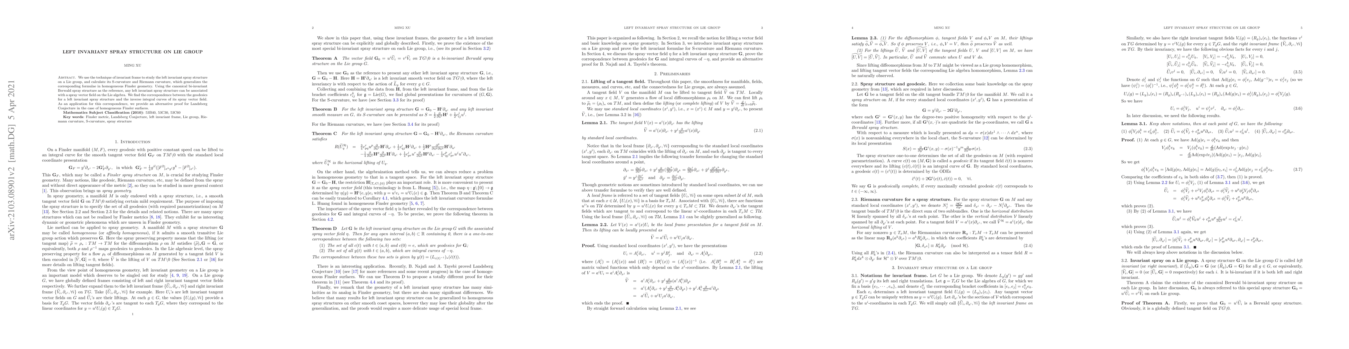 We use the technique of invariant frames to study a left invariant spray structure on a Lie group, and calculate its S-curvature and Riemann curvature, which generalizes the corresponding formulae in homogeneous Finsler geometry. Using the canonical bi-invariant Berwald spray structure as the reference, any left invariant spray structure can be associated with a spray vector field on the Lie algebra. We find the correspondence between geodesics for a left invariant spray structure and the inverse integral curves of its spray vector field. As an application for this correspondence, we provide an alternative proof for Landsberg Conjecture in the case of homogeneous Finsler surfaces.
