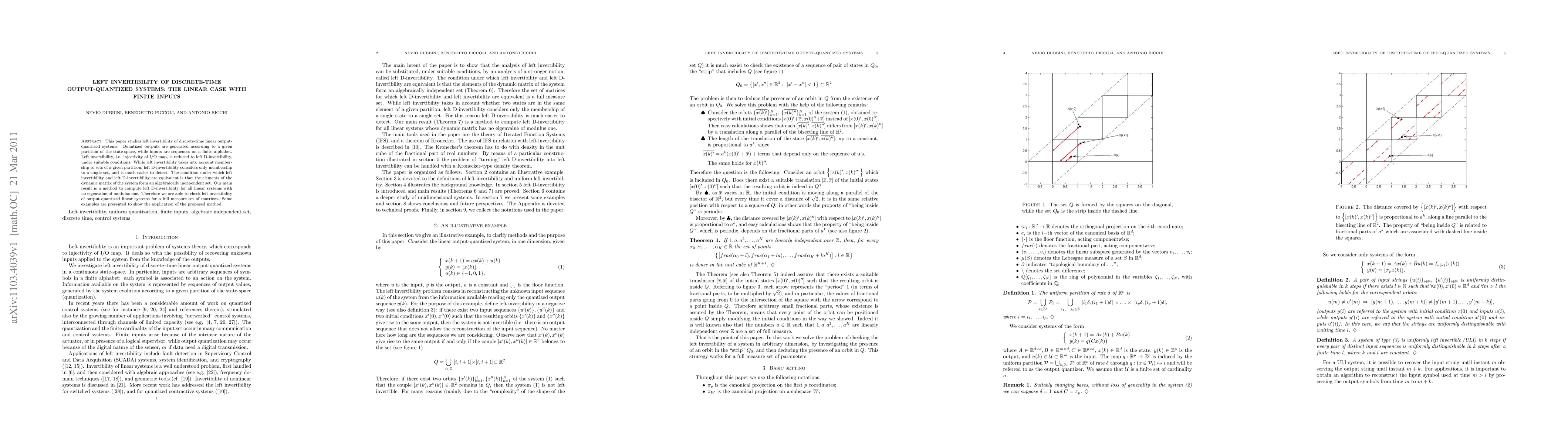 This paper investigates left invertibility in discrete-time linear systems with output quantization, showing that left D-invertibility suffices under certain conditions. The study provides a method to compute left D-invertibility for systems without eigenvalues of modulus one, enabling the verification of left invertibility for a broad class of matrices.
