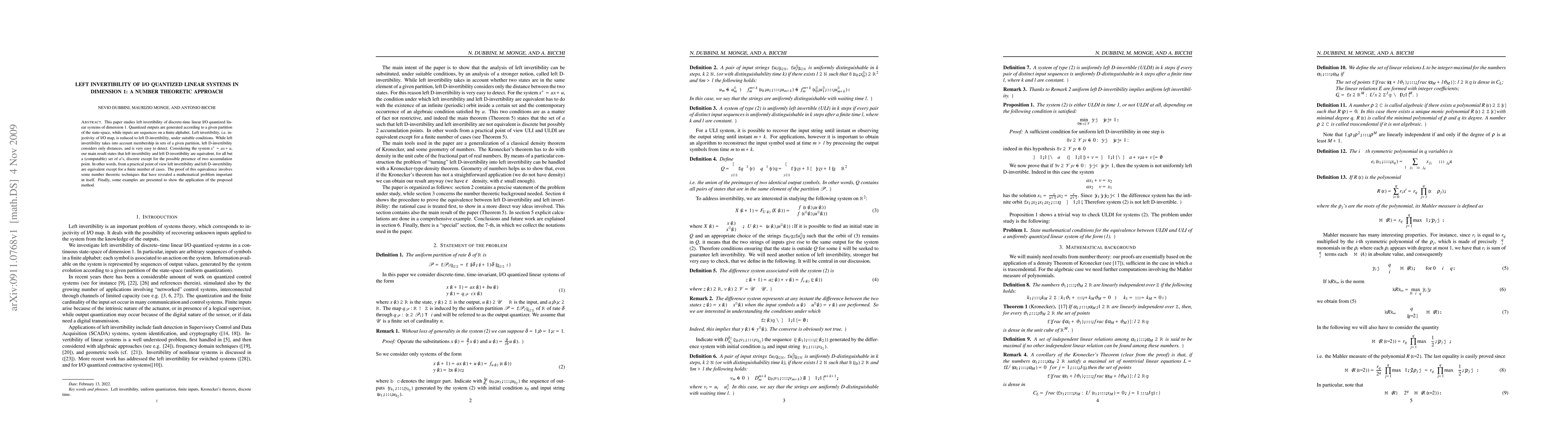 This paper studies left invertibility of discrete-time linear I/O quantized linear systems of dimension 1. Quantized outputs are generated according to a given partition of the state-space, while inputs are sequences on a finite alphabet. Left invertibility, i.e. injectivity of I/O map, is reduced to left D-invertibility, under suitable conditions. While left invertibility takes into account membership in sets of a given partition, left D-invertibility considers only distances, and is very easy to detect. Considering the system $x^+=ax+u$, our main result states that left invertibility and left D-invertibility are equivalent, for all but a (computable) set of $a$'s, discrete except for the possible presence of two accumulation point. In other words, from a practical point of view left invertibility and left D--invertibility are equivalent except for a finite number of cases. The proof of this equivalence involves some number theoretic techniques that have revealed a mathematical problem important in itself. Finally, some examples are presented to show the application of the proposed method.