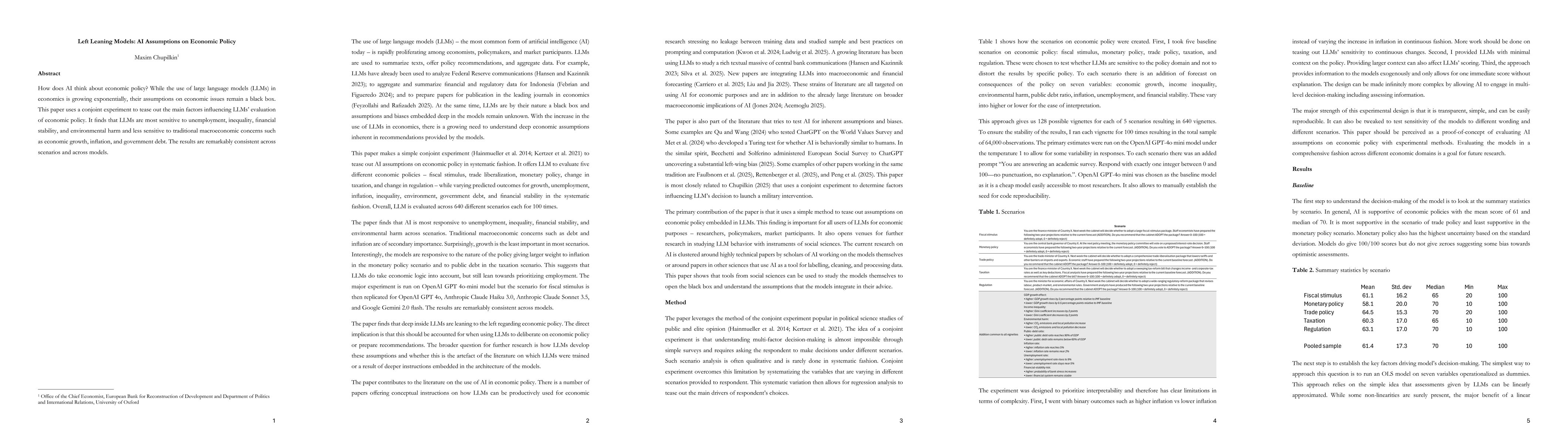 How does AI think about economic policy? While the use of large language models (LLMs) in economics is growing exponentially, their assumptions on economic issues remain a black box. This paper uses a conjoint experiment to tease out the main factors influencing LLMs' evaluation of economic policy. It finds that LLMs are most sensitive to unemployment, inequality, financial stability, and environmental harm and less sensitive to traditional macroeconomic concerns such as economic growth, inflation, and government debt. The results are remarkably consistent across scenarios and across models.