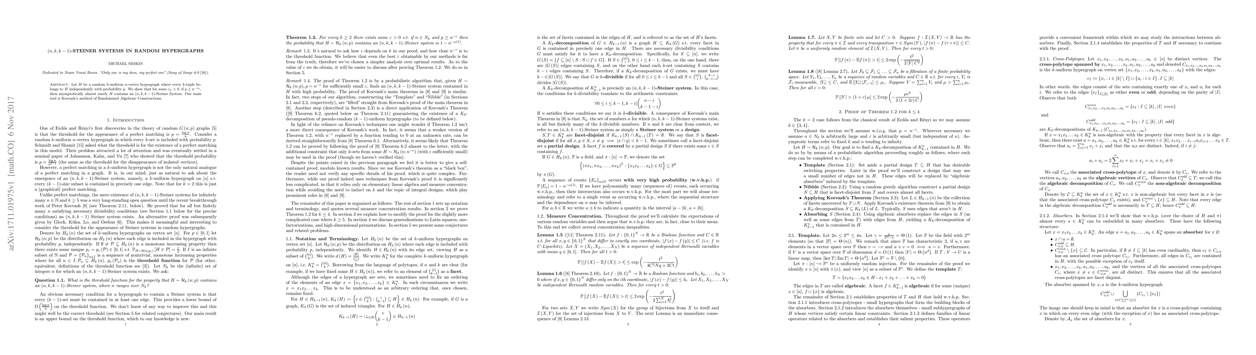 Let $H$ be a random $k$-uniform $n$-vertex hypergraph where every $k$-tuple belongs to $H$ independently with probability $p$. We show that for some $\varepsilon_k > 0$, if $p \geq n^{-\varepsilon_k}$, then asymptotically almost surely $H$ contains an $\left( n , k , k - 1 \right)$-Steiner System. Our main tool is Keevash's method of Randomized Algebraic Constructions.