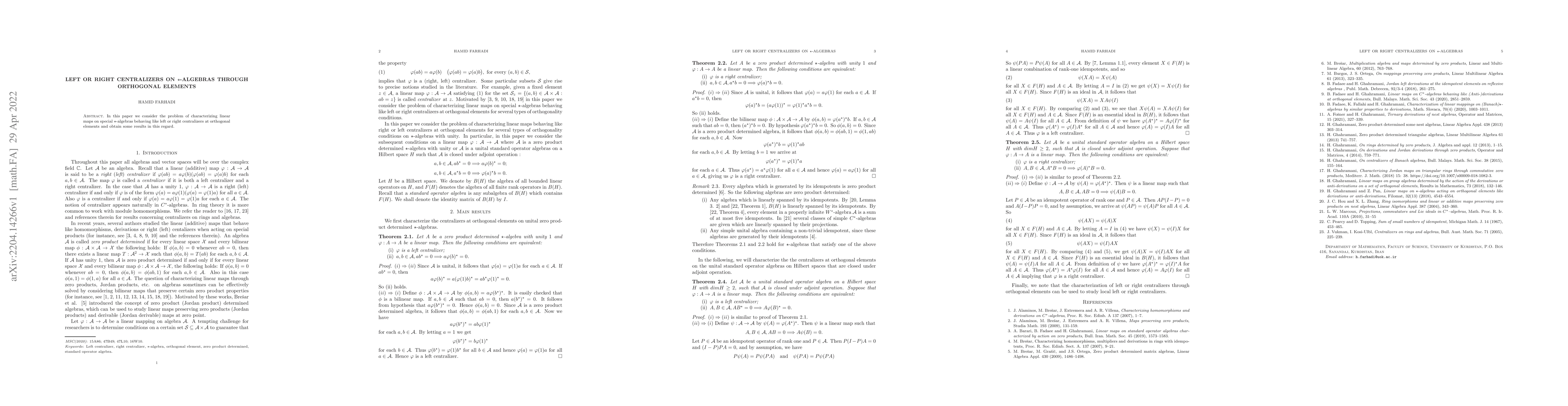 In this paper we consider the problem of characterizing linear maps on special $ \star $-algebras behaving like left or right centralizers at orthogonal elements and obtain some results in this regard.