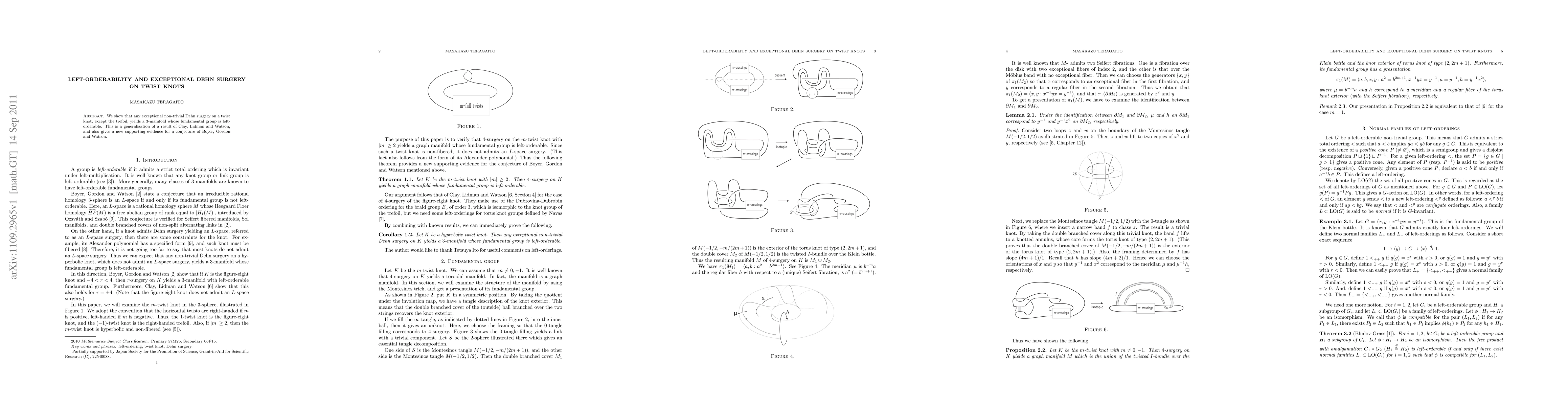 This paper demonstrates that exceptional non-trivial Dehn surgery on twist knots, excluding the trefoil, results in a 3-manifold with a left-orderable fundamental group, extending previous findings and supporting a conjecture in knot theory.