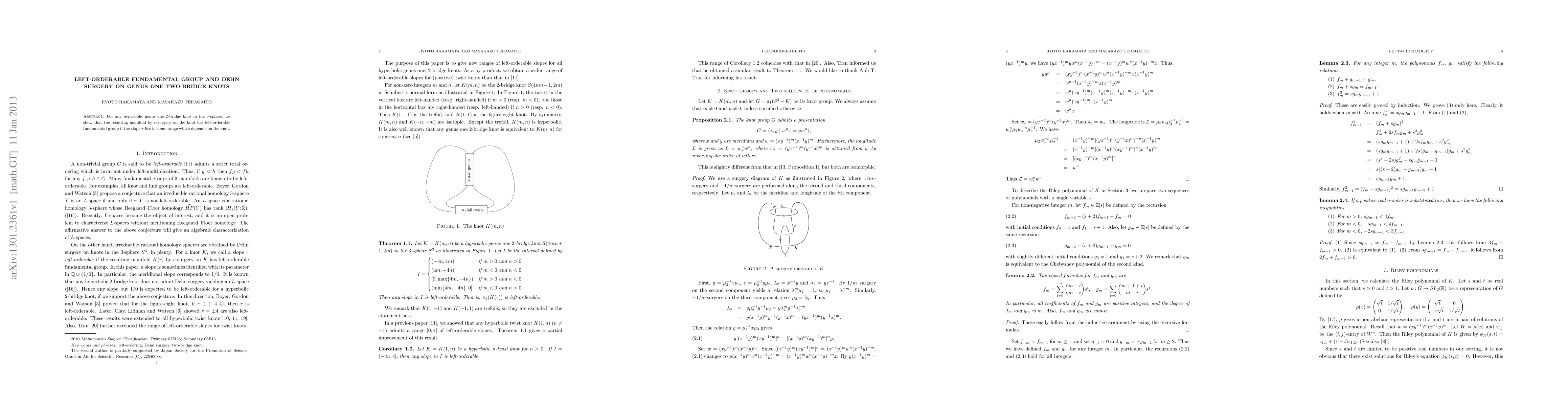 Summary: This paper demonstrates that for hyperbolic genus one 2-bridge knots in the 3-sphere, $r$-surgery on the knot results in a manifold with a left-orderable fundamental group when the slope $r$ falls within a specific range determined by the knot.