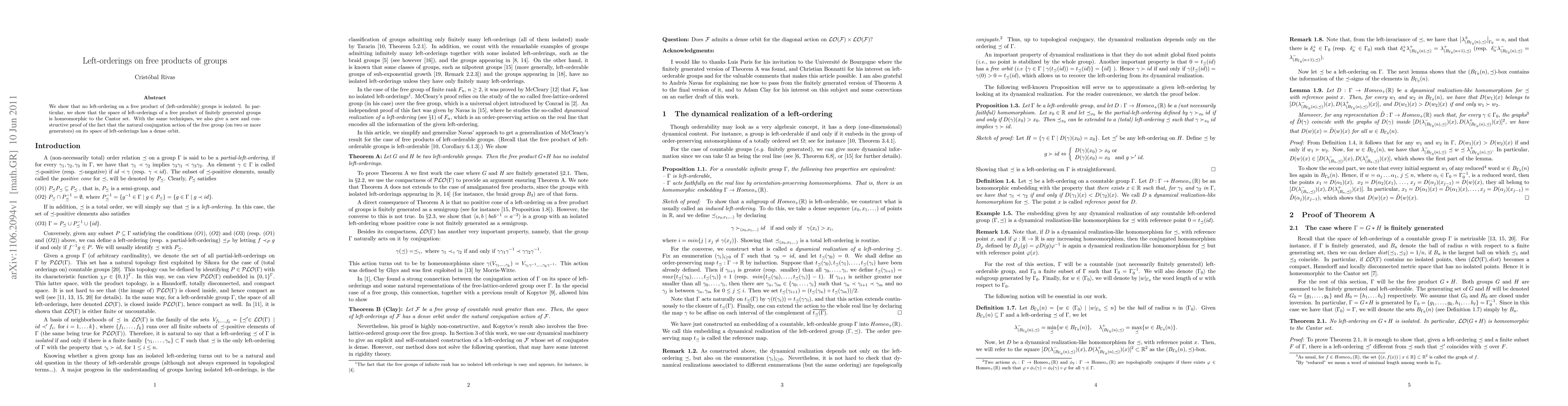 This paper demonstrates that no left-ordering on a free product of left-orderable groups is isolated, showing that the space of such left-orderings is homeomorphic to the Cantor set. Additionally, it provides a constructive proof that the natural conjugation action of a free group on its space of left-orderings has a dense orbit.