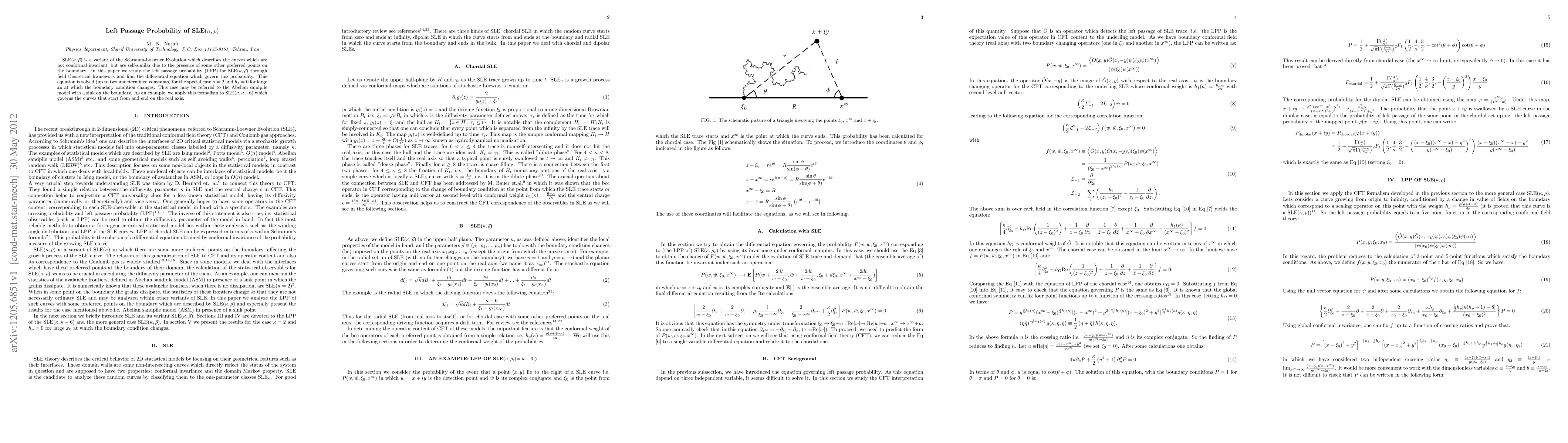 This paper investigates the left passage probability (LPP) for the SLE($\kappa,\rho$) process through a field theoretical approach, deriving a differential equation governing LPP. For $\kappa=2$ and $h_\rho=0$, the equation is solved for large initial conditions, demonstrating its application to the Abelian sandpile model with a boundary sink.