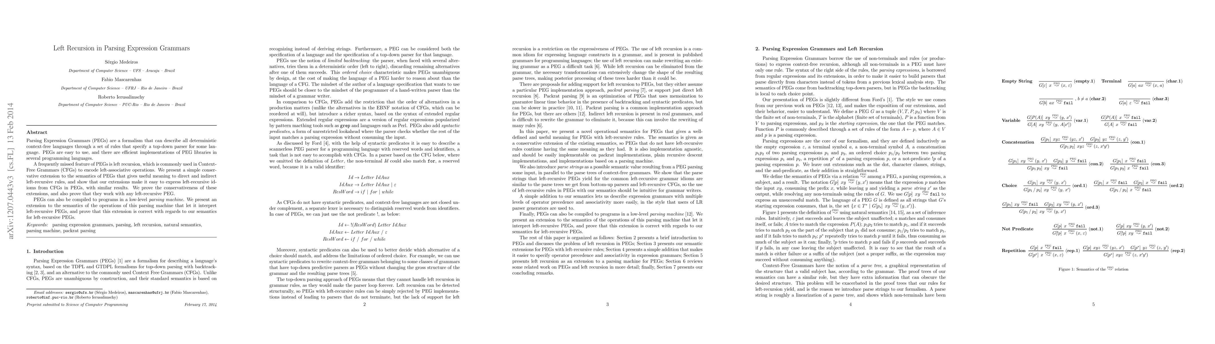 This paper introduces a conservative extension to Parsing Expression Grammars (PEGs) that allows for meaningful interpretation of left-recursive rules, enabling the expression of left-recursive constructs commonly found in Context-Free Grammars (CFGs). The authors also extend the semantics of parsing machines to handle these left-recursive PEGs correctly.