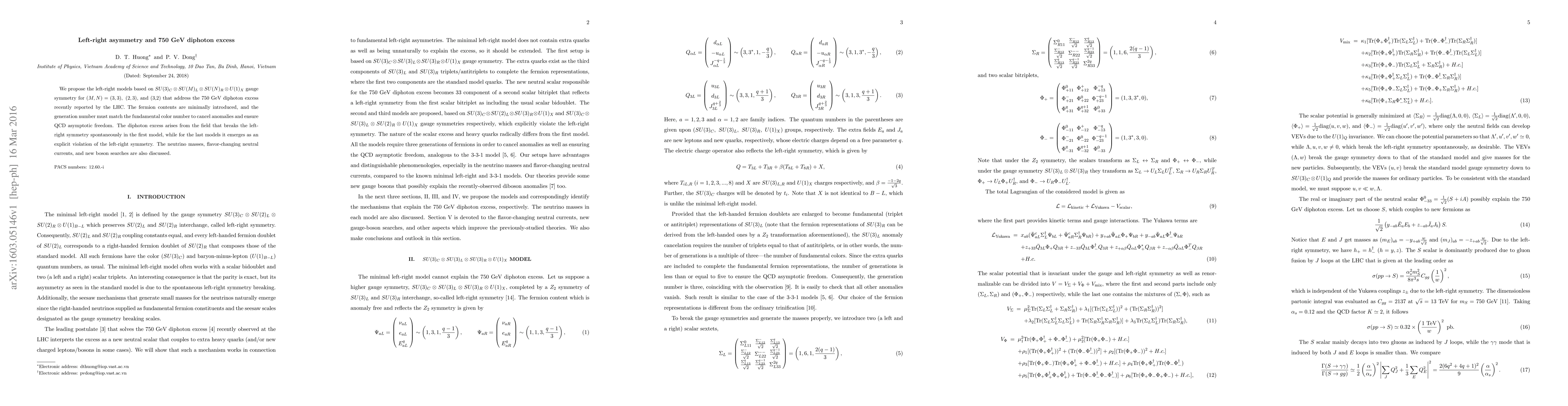 We propose the left-right models based on SU(3)_C\otimes SU(M)_L \otimes SU(N)_R \otimes U(1)_X gauge symmetry for (M,N)=(3,3), (2,3), and (3,2) that address the 750 GeV diphoton excess recently reported by the LHC. The fermion contents are minimally introduced, and the generation number must match the fundamental color number to cancel anomalies and ensure QCD asymptotic freedom. The diphoton excess arises from the field that breaks the left-right symmetry spontaneously in the first model, while for the last models it emerges as an explicit violation of the left-right symmetry. The neutrino masses, flavor-changing neutral currents, and new boson searches are also discussed.