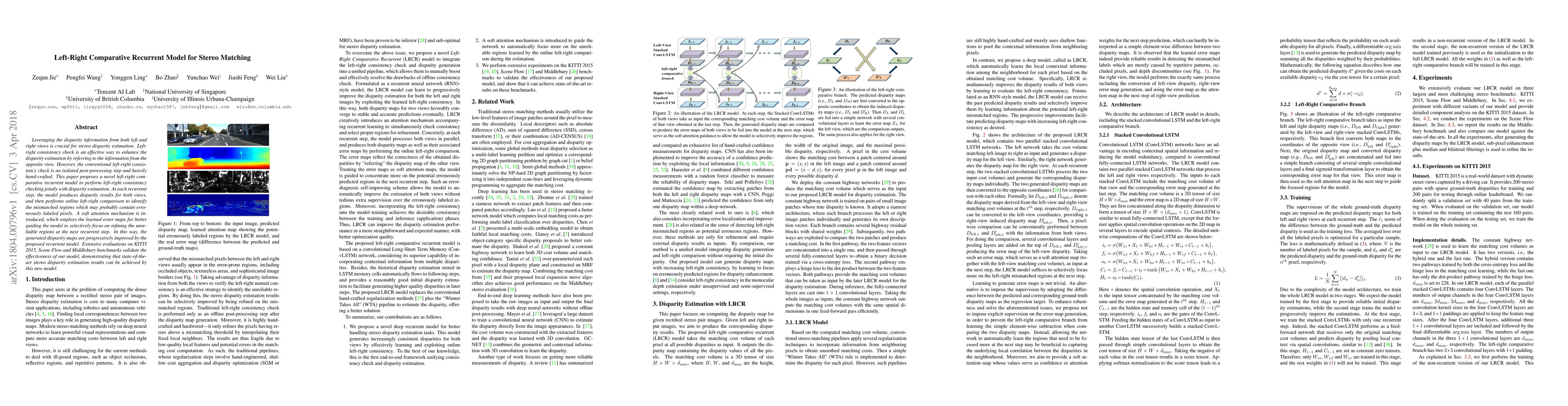 This paper proposes a novel left-right comparative recurrent model for stereo matching that jointly performs disparity estimation and left-right consistency checking. The model iteratively refines disparity maps by identifying and correcting mismatched regions using a soft attention mechanism, leading to improved accuracy on benchmark datasets.