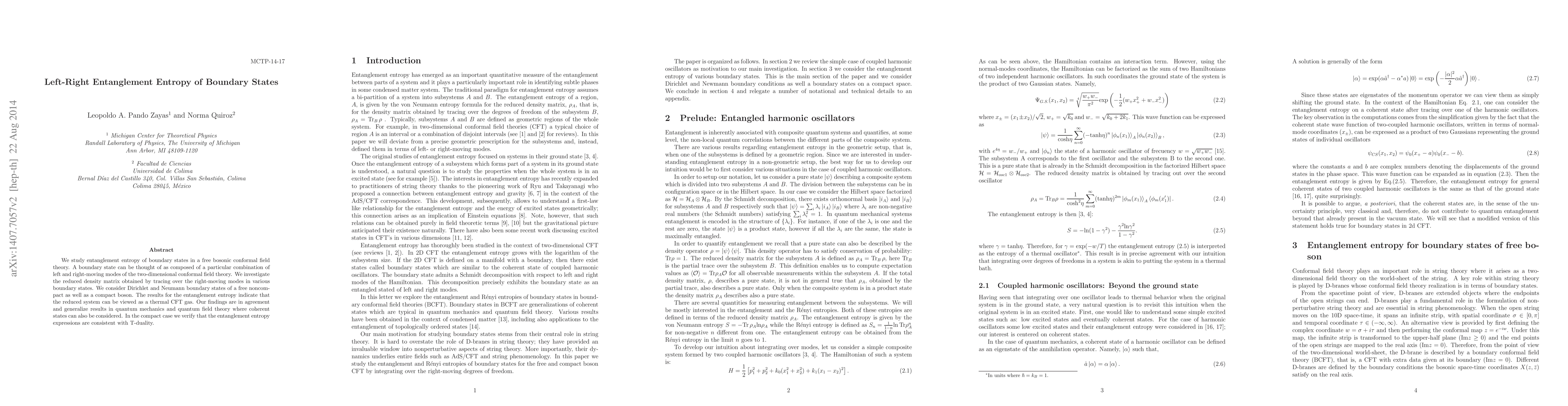 This paper investigates the entanglement entropy of boundary states in free bosonic conformal field theory, focusing on left-right mode combinations and comparing Dirichlet and Neumann states. The results reveal that tracing over right-moving modes yields thermal CFT gas behavior, with findings consistent with T-duality in the compact boson case.