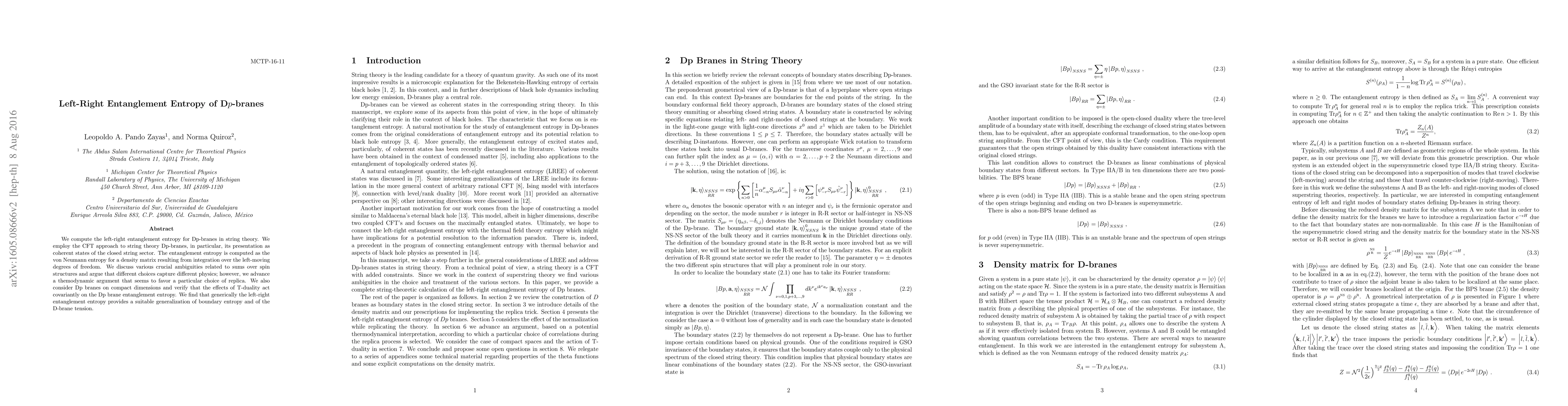 We compute the left-right entanglement entropy for Dp-branes in string theory. We employ the CFT approach to string theory Dp-branes, in particular, its presentation as coherent states of the closed string sector. The entanglement entropy is computed as the von Neumann entropy for a density matrix resulting from integration over the left-moving degrees of freedom. We discuss various crucial ambiguities related to sums over spin structures and argue that different choices capture different physics; however, we advance a themodynamic argument that seems to favor a particular choice of replica. We also consider Dp branes on compact dimensions and verify that the effects of T-duality act covariantly on the Dp brane entanglement entropy. We find that generically the left-right entanglement entropy provides a suitable generalization of boundary entropy and of the D-brane tension.