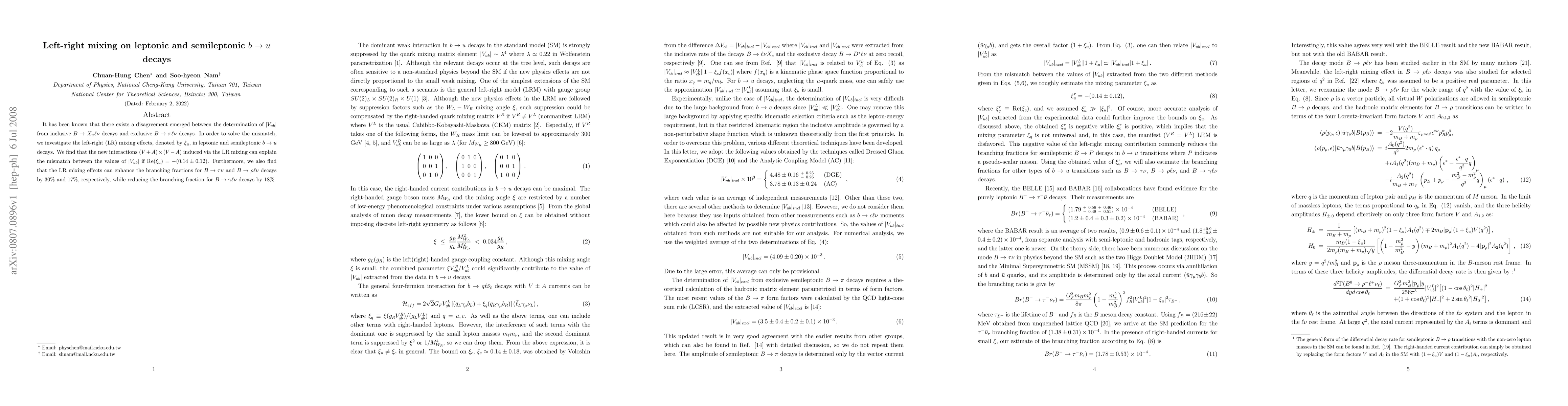 This paper investigates left-right mixing effects, denoted by $\xi_u$, in $b \to u$ decays to resolve the mismatch in $|V_{ub}|$ determinations. The study finds that the $(V+A)\times (V-A)$ interactions induced by LR mixing can explain the discrepancy if Re$(\xi_{u})=-(0.14 \pm 0.12)$.