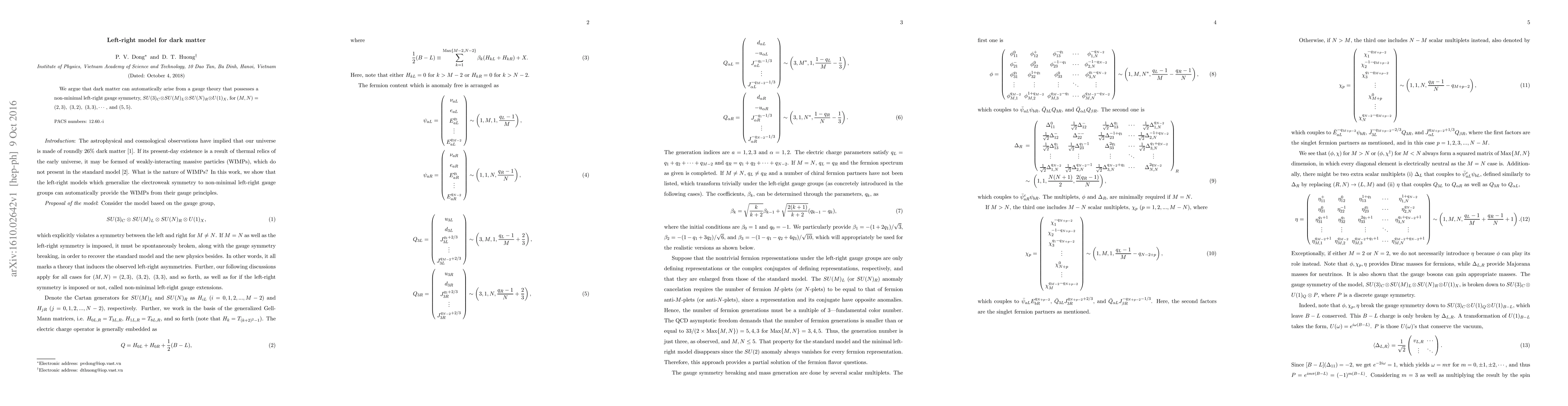 This paper proposes a left-right symmetric gauge theory model where dark matter naturally emerges from the non-minimal symmetry structure, specifically for combinations of (M,N) values like (2,3) and (3,3). The model incorporates SU(3)_C, SU(M)_L, SU(N)_R, and U(1)_X symmetries.