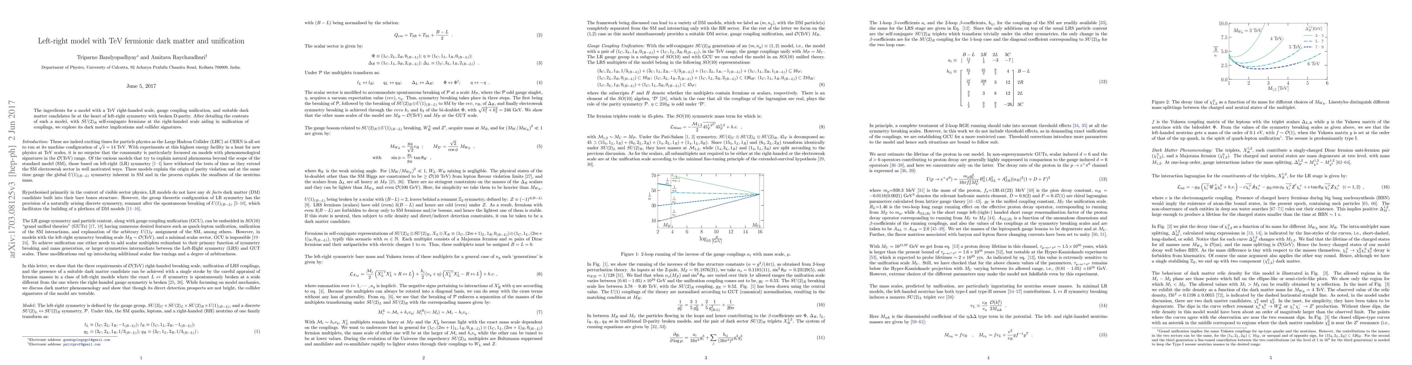 This paper proposes a left-right symmetric model featuring TeV-scale right-handed fermions that unify gauge couplings and provide viable dark matter candidates, while exploring its implications and potential collider signatures.