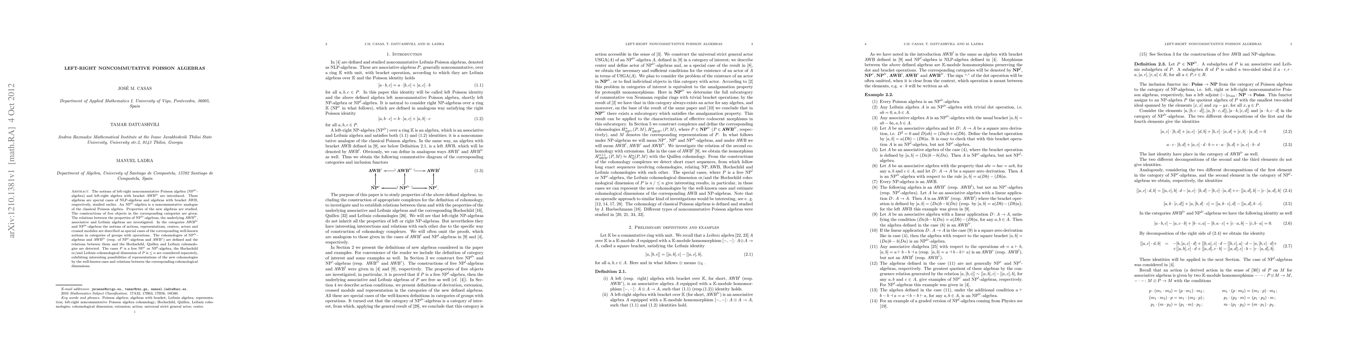 The notions of left-right noncommutative Poisson algebra ($\NP^{lr}$-algebra) and left-right algebra with bracket $\AWB^{lr}$ are introduced. These algebras are special cases of $\NLP$-algebras and algebras with bracket $\AWB$, respectively, studied earlier. An $\NP^{lr}$-algebra is a noncommutative analogue of the classical Poisson algebra. Properties of the new algebras are studied. The constructions of free objects in the corresponding categories are given. The relations between the properties of $\NP^{lr}$-algebras, the underlying $\AWB^{lr}$, associative and Leibniz algebras are investigated. In the categories $\AWB^{lr}$ and $\NP^{lr}$-algebras the notions of actions, representations, centers, actors and crossed modules are described as special cases of the corresponding well-known notions in categories of groups with operations. The cohomologies of $\NP^{lr}$-algebras and $\AWB^{lr}$ (resp. of $\NP^r$-algebras and $\AWB^r$) are defined and the relations between them and the Hochschild, Quillen and Leibniz cohomologies are detected. The cases $P$ is a free $\NP^{r}$ or $\NP^{l}$-algebra, the Hochschild or/and Leibniz cohomological dimension of $P$ is $\leq n$ are considered separately, exhibiting interesting possibilities of representations of the new cohomologies by the well-known ones and relations between the corresponding cohomological dimensions.