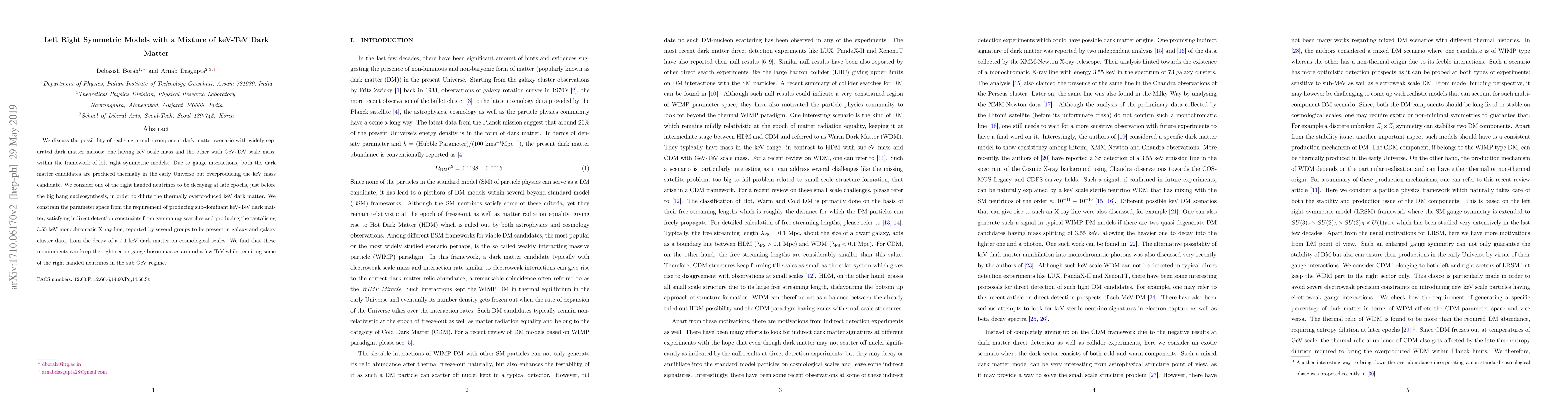 This paper explores a multi-component dark matter model in left-right symmetric frameworks, featuring keV and GeV-TeV scale dark matter masses. It proposes a decay mechanism for overproduced keV dark matter and constrains the parameter space to satisfy indirect detection constraints and explain the 3.55 keV X-ray line, while keeping right sector gauge bosons at a few TeV and some right-handed neutrinos in the sub-GeV regime.