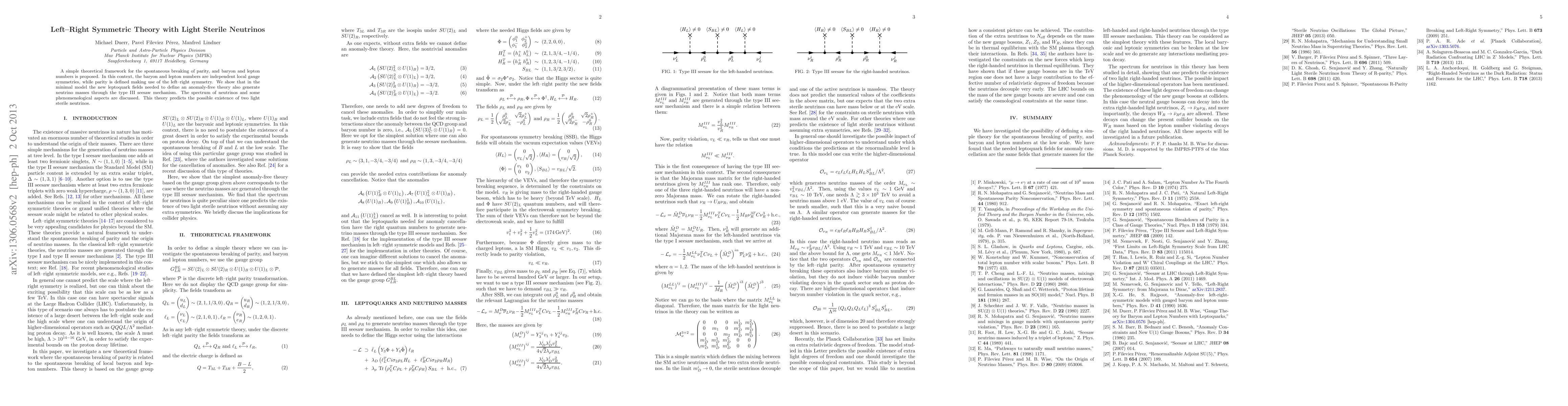 A simple theoretical framework for the spontaneous breaking of parity, baryon and lepton numbers is proposed. In this context, the baryon and lepton numbers are independent local gauge symmetries, while parity is defined making use of the left-right symmetry. We show that in the minimal model the new leptoquark fields needed to define an anomaly-free theory also generate neutrino masses through the type III seesaw mechanism. The spectrum of neutrinos and some phenomenological aspects are discussed. This theory predicts the possible existence of two light sterile neutrinos.