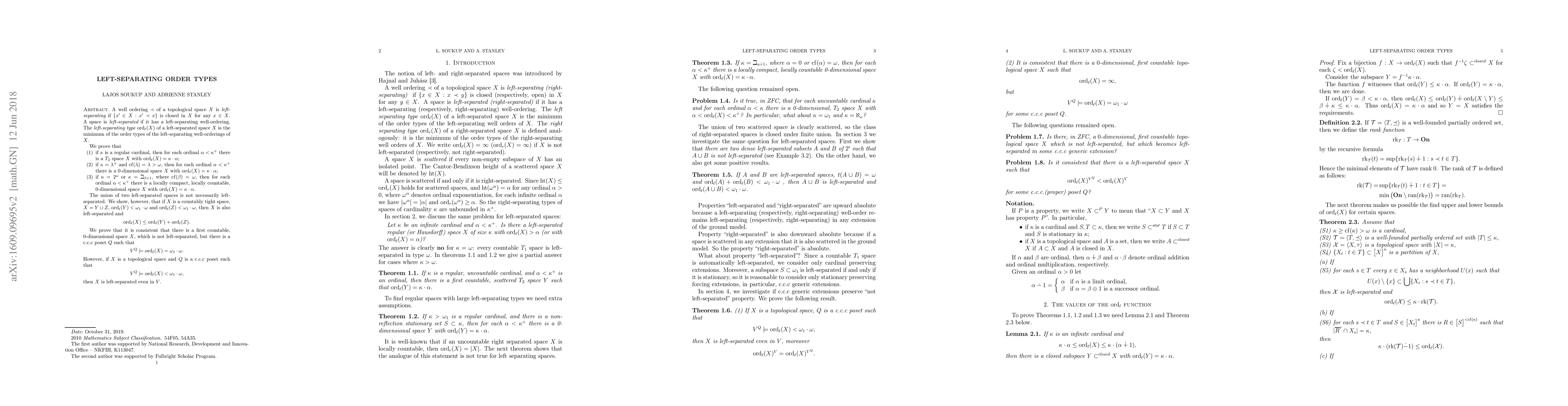 A well ordering < of a topological space X is "left-separating" if $\{x'\in X: x'< x\}$ is closed in X for any x in X. A space is "left-separated" if it has a left-separating well-ordering. The left-separating type, $ord_l(X)$, of a left-separated space X is the minimum of the order types of the left-separating well orderings of X. We prove that (1) if ${\kappa}$ is a regular cardinal, then for each ordinal ${\alpha}<{\kappa}^+$ there is a $T_2$ space $X$ with $ord_l(X)={\kappa}\cdot {\alpha}$; (2) if ${\kappa}={\lambda}^+$ and $cf({\lambda})={\lambda}>{\omega}$, then for each ordinal ${\alpha}<{\kappa}^+$ there is a 0-dimensional space $X$ with $ord_l( X)={\kappa}\cdot {\alpha}$; (3) if ${\kappa}=2^{\omega}$ or ${\kappa}=\beth_{{\beta}+1}$, where $cf({\beta})={\omega}$, then for each ordinal ${\alpha}<{\kappa}^+$ there is a locally compact, locally countable, 0-dimensional space $X$ with $ord_l( X)={\kappa}\cdot {\alpha}$. The union of two left-separated spaces is not necessarily left-separated. We show, however, that if X is a countably tight space, $X=Y\cup Z, ord_l(Y)$, $ord_l(Z)<\omega_1 \cdot \omega$, then $X$ is also left-separated and $ord_l(X)\le ord_l(Y)+ord_l(Z)$. We prove that it is consistent that there is a first countable, 0-dimensional space X, which is not left-separated, but there is a c.c.c poset Q such that in the generic extension $V^Q$ we have $ord_l(X)=\omega_1 \cdot \omega$. However, if $X$ is a topological space and $Q$ is a c.c.c poset such that in in the generic extension $V^Q$ we have $ord_l(X)<\omega_1 \cdot \omega$ then X is left-separated even in $V$.