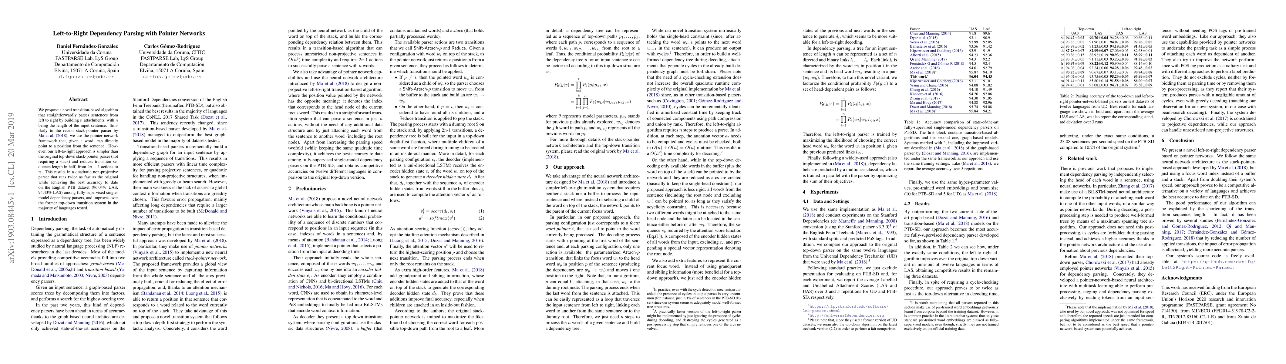 This paper introduces a left-to-right dependency parser using a pointer network, which simplifies the parsing process and halves the transition sequence length, resulting in improved speed and accuracy on the English PTB dataset compared to previous models.