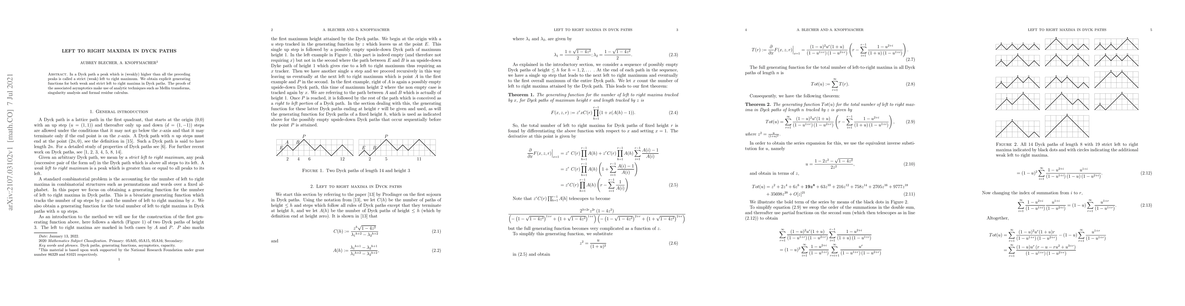 This paper presents explicit generating functions for weak and strict left to right maxima in Dyck paths. The proofs employ analytic techniques including Mellin transforms, singularity analysis, and formal residue calculus to derive the associated asymptotics.