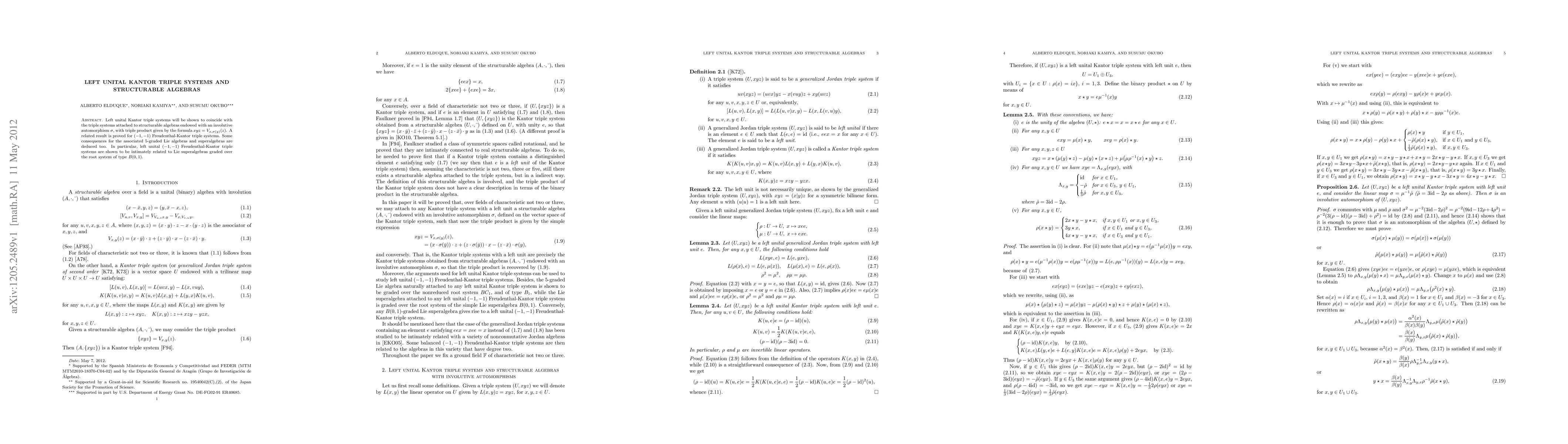 Left unital Kantor triple systems will be shown to correspond to structurable algebras endowed with an involutive automorphism. A related result is proved for (-1,-1) Freudenthal-Kantor triple systems. Some consequences for the associated 5-graded Lie algebras and superalgebras are deduced too. In particular, left unital (-1,-1) Freudenthal-Kantor triple systems are shown to be intimately related to Lie superalgebras graded over the root system of type B(0,1).