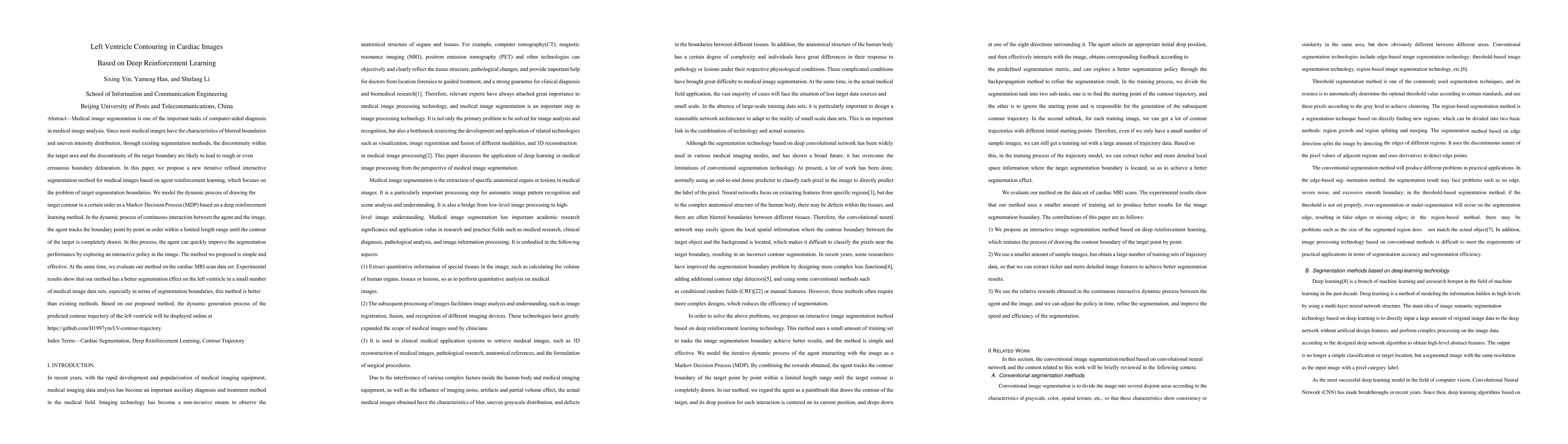 The research proposes an iterative refined interactive segmentation method for medical images using an agent-based deep reinforcement learning (DRL) approach, modeling the dynamic process of contour drawing as a Markov Decision Process (MDP). The agent improves segmentation performance through interactive policy exploration, focusing on precise target boundary segmentation, particularly for left ventricle in cardiac MRI scans.