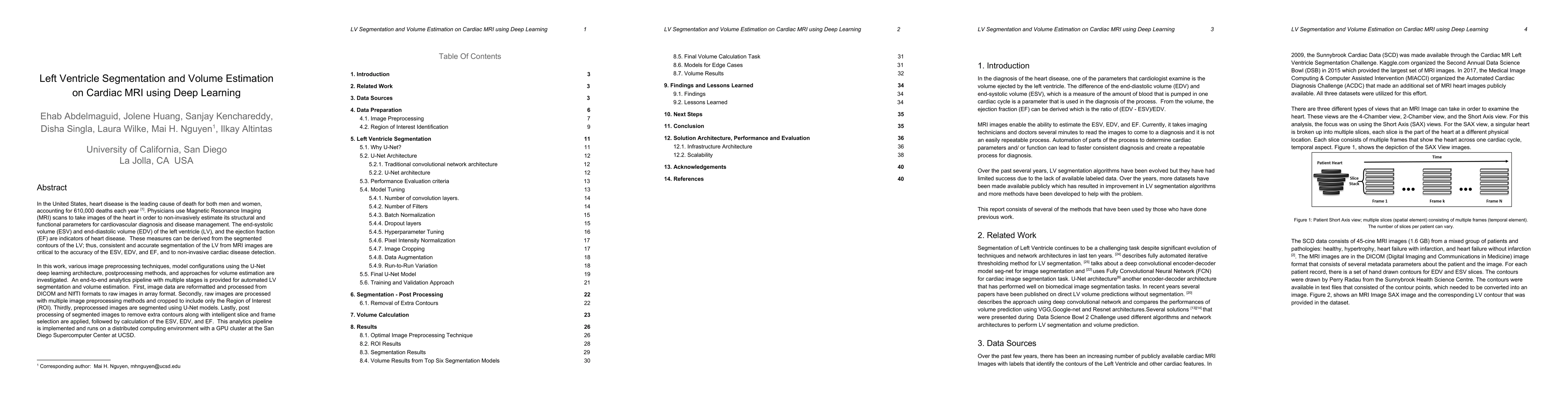 In the United States, heart disease is the leading cause of death for both men and women, accounting for 610,000 deaths each year [1]. Physicians use Magnetic Resonance Imaging (MRI) scans to take images of the heart in order to non-invasively estimate its structural and functional parameters for cardiovascular diagnosis and disease management. The end-systolic volume (ESV) and end-diastolic volume (EDV) of the left ventricle (LV), and the ejection fraction (EF) are indicators of heart disease. These measures can be derived from the segmented contours of the LV; thus, consistent and accurate segmentation of the LV from MRI images are critical to the accuracy of the ESV, EDV, and EF, and to non-invasive cardiac disease detection. In this work, various image preprocessing techniques, model configurations using the U-Net deep learning architecture, postprocessing methods, and approaches for volume estimation are investigated. An end-to-end analytics pipeline with multiple stages is provided for automated LV segmentation and volume estimation. First, image data are reformatted and processed from DICOM and NIfTI formats to raw images in array format. Secondly, raw images are processed with multiple image preprocessing methods and cropped to include only the Region of Interest (ROI). Thirdly, preprocessed images are segmented using U-Net models. Lastly, post processing of segmented images to remove extra contours along with intelligent slice and frame selection are applied, followed by calculation of the ESV, EDV, and EF. This analytics pipeline is implemented and runs on a distributed computing environment with a GPU cluster at the San Diego Supercomputer Center at UCSD.