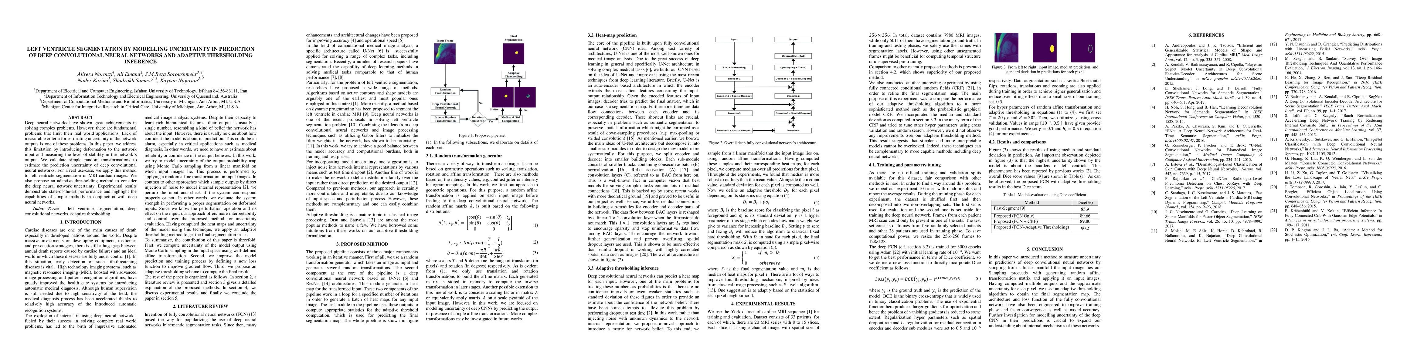 This paper proposes a method for estimating uncertainty in deep convolutional neural networks (CNNs) by applying deformation to network inputs and measuring stability in outputs. It applies this uncertainty estimation to left ventricle segmentation in MRI cardiac images, incorporating an adaptive thresholding method to enhance performance, achieving state-of-the-art results.