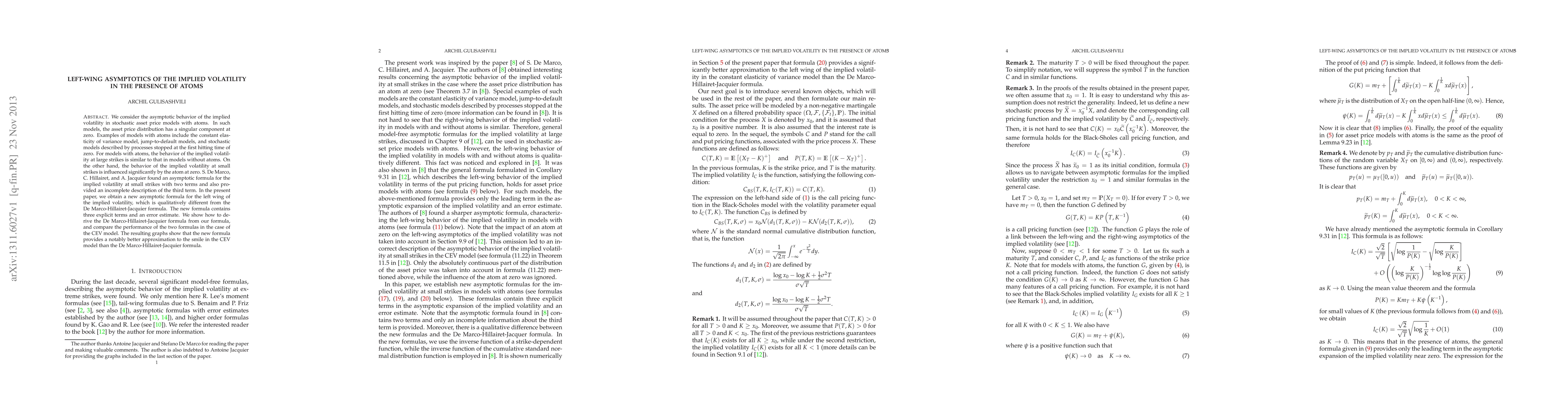 The paper presents a novel asymptotic formula for the left wing of implied volatility in models with atoms, offering improved accuracy over existing formulas, especially in the CEV model.