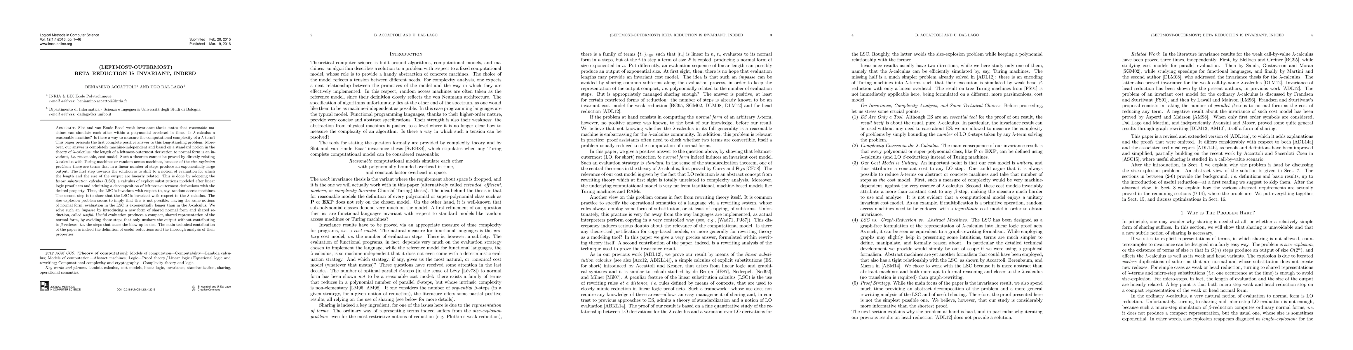 Slot and van Emde Boas' weak invariance thesis states that reasonable machines can simulate each other within a polynomially overhead in time. Is lambda-calculus a reasonable machine? Is there a way to measure the computational complexity of a lambda-term? This paper presents the first complete positive answer to this long-standing problem. Moreover, our answer is completely machine-independent and based over a standard notion in the theory of lambda-calculus: the length of a leftmost-outermost derivation to normal form is an invariant cost model. Such a theorem cannot be proved by directly relating lambda-calculus with Turing machines or random access machines, because of the size explosion problem: there are terms that in a linear number of steps produce an exponentially long output. The first step towards the solution is to shift to a notion of evaluation for which the length and the size of the output are linearly related. This is done by adopting the linear substitution calculus (LSC), a calculus of explicit substitutions modeled after linear logic proof nets and admitting a decomposition of leftmost-outermost derivations with the desired property. Thus, the LSC is invariant with respect to, say, random access machines. The second step is to show that LSC is invariant with respect to the lambda-calculus. The size explosion problem seems to imply that this is not possible: having the same notions of normal form, evaluation in the LSC is exponentially longer than in the lambda-calculus. We solve such an impasse by introducing a new form of shared normal form and shared reduction, deemed useful. Useful evaluation avoids those steps that only unshare the output without contributing to beta-redexes, i.e. the steps that cause the blow-up in size. The main technical contribution of the paper is indeed the definition of useful reductions and the thorough analysis of their properties.