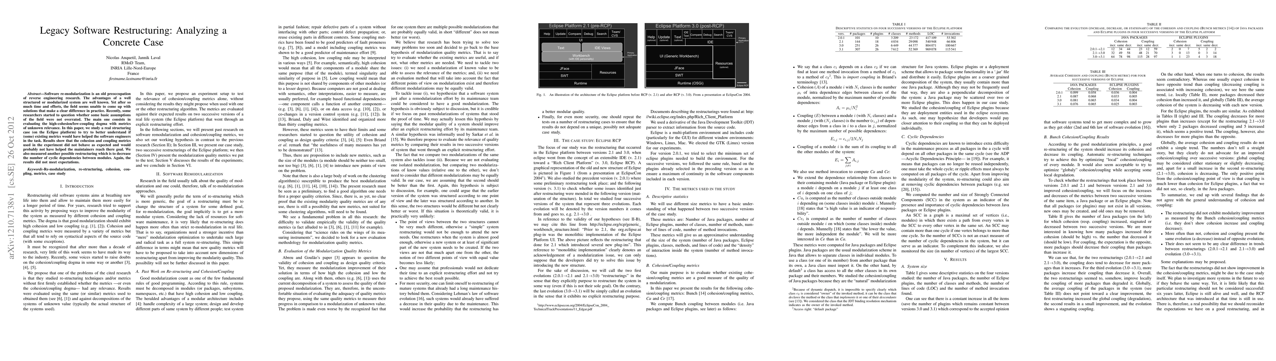 Software re-modularization is an old preoccupation of reverse engineering research. The advantages of a well structured or modularized system are well known. Yet after so much time and efforts, the field seems unable to come up with solutions that make a clear difference in practice. Recently, some researchers started to question whether some basic assumptions of the field were not overrated. The main one consists in evaluating the high-cohesion/low-coupling dogma with metrics of unknown relevance. In this paper, we study a real structuring case (on the Eclipse platform) to try to better understand if (some) existing metrics would have helped the software engineers in the task. Results show that the cohesion and coupling metrics used in the experiment did not behave as expected and would probably not have helped the maintainers reach there goal. We also measured another possible restructuring which is to decrease the number of cyclic dependencies between modules. Again, the results did not meet expectations.