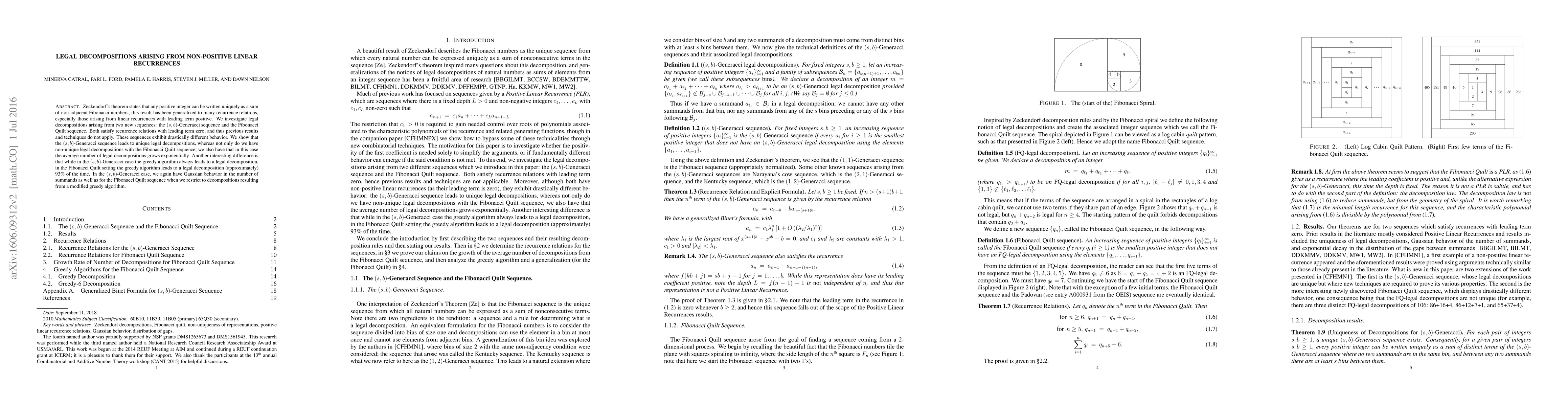 Zeckendorf's theorem states that any positive integer can be written uniquely as a sum of non-adjacent Fibonacci numbers; this result has been generalized to many recurrence relations, especially those arising from linear recurrences with leading term positive. We investigate legal decompositions arising from two new sequences: the $(s,b)$-Generacci sequence and the Fibonacci Quilt sequence. Both satisfy recurrence relations with leading term zero, and thus previous results and techniques do not apply. These sequences exhibit drastically different behavior. We show that the $(s,b)$-Generacci sequence leads to unique legal decompositions, whereas not only do we have non-unique legal decompositions with the Fibonacci Quilt sequence, we also have that in this case the average number of legal decompositions grows exponentially. Another interesting difference is that while in the $(s,b)$-Generacci case the greedy algorithm always leads to a legal decomposition, in the Fibonacci Quilt setting the greedy algorithm leads to a legal decomposition (approximately) 93\% of the time. In the $(s,b)$-Generacci case, we again have Gaussian behavior in the number of summands as well as for the Fibonacci Quilt sequence when we restrict to decompositions resulting from a modified greedy algorithm.