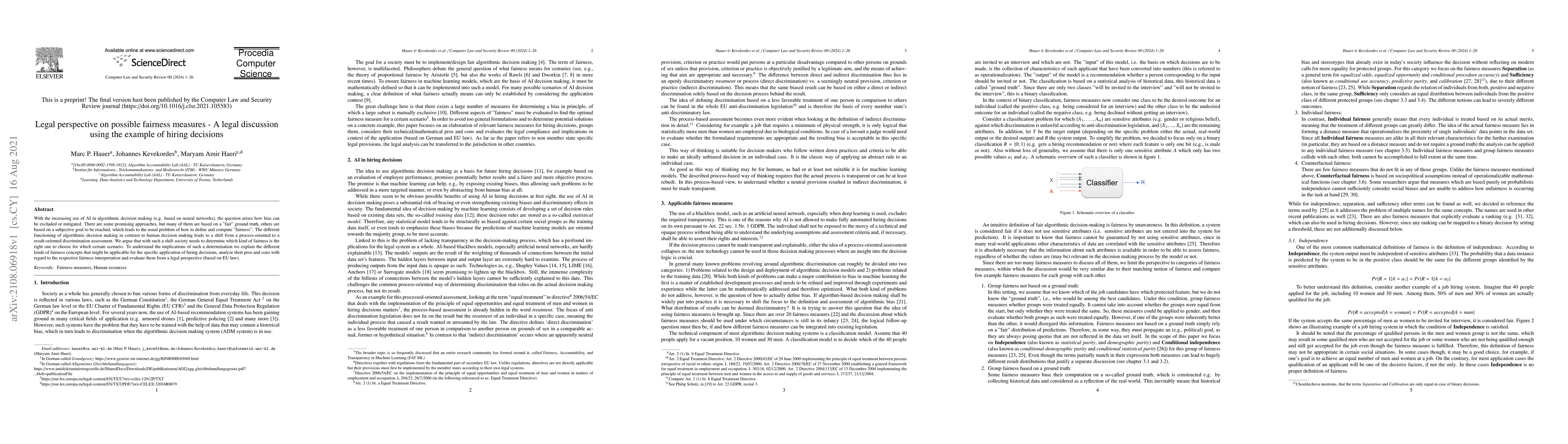 This paper explores fairness measures in AI-driven hiring decisions, addressing the challenge of defining and implementing fairness in algorithmic decision-making. It evaluates various fairness concepts, assessing their legal implications under EU law and discusses the necessity of determining which fairness approach is appropriate for specific scenarios.
