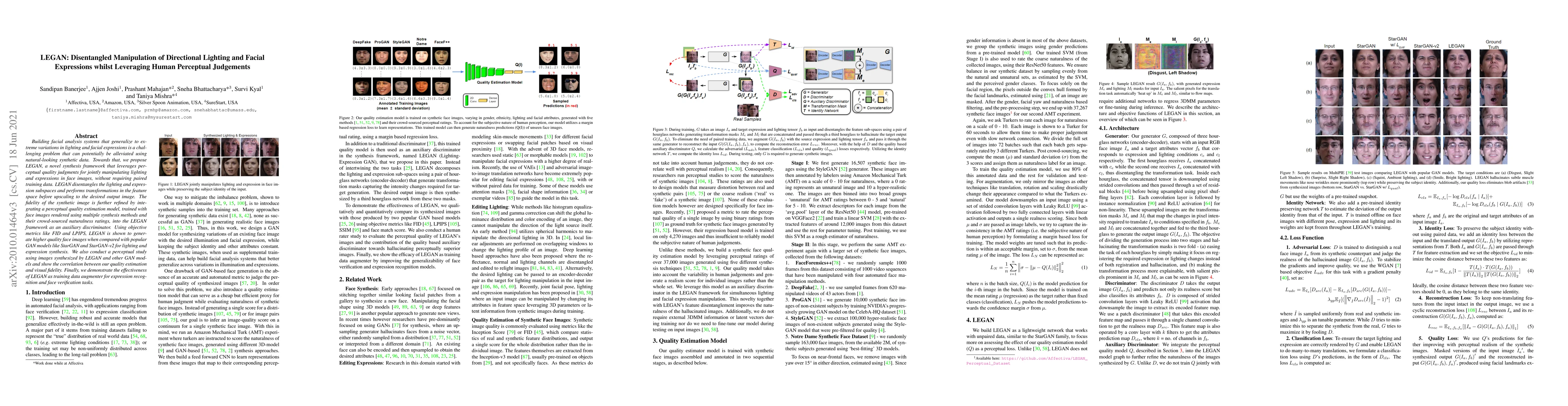 LEGAN is a novel synthesis framework that disentangles lighting and facial expressions in face images using perceptual quality judgments, generating higher-fidelity synthetic data compared to other GAN models. It enhances expression recognition and face verification tasks through improved training data augmentation.