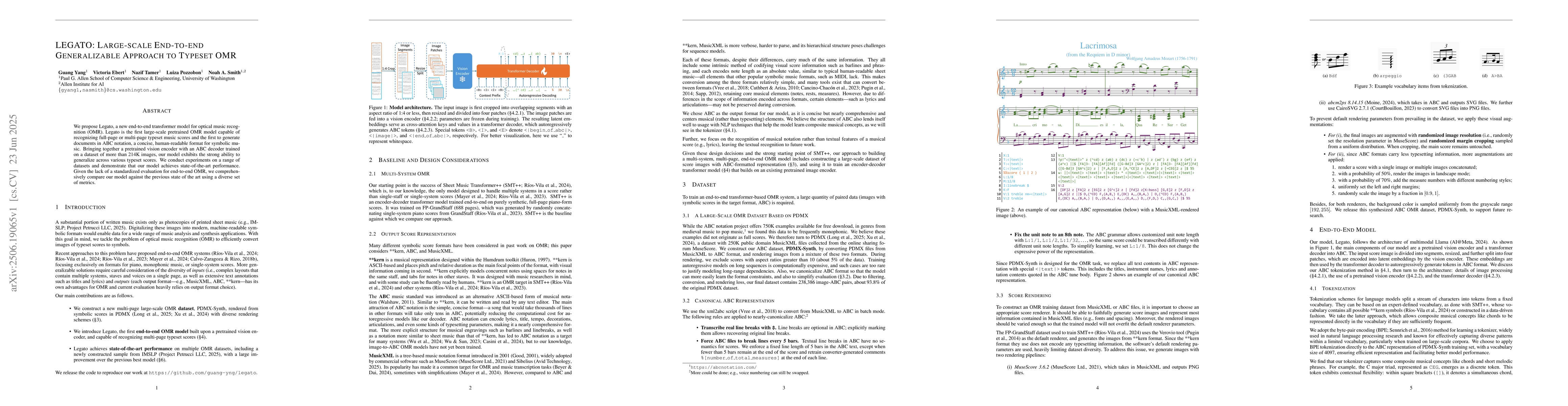 The introduction of Legato, a large-scale pretrained OMR model that combines a vision encoder with an ABC decoder, enabling recognition and generation of typeset music scores in ABC notation.