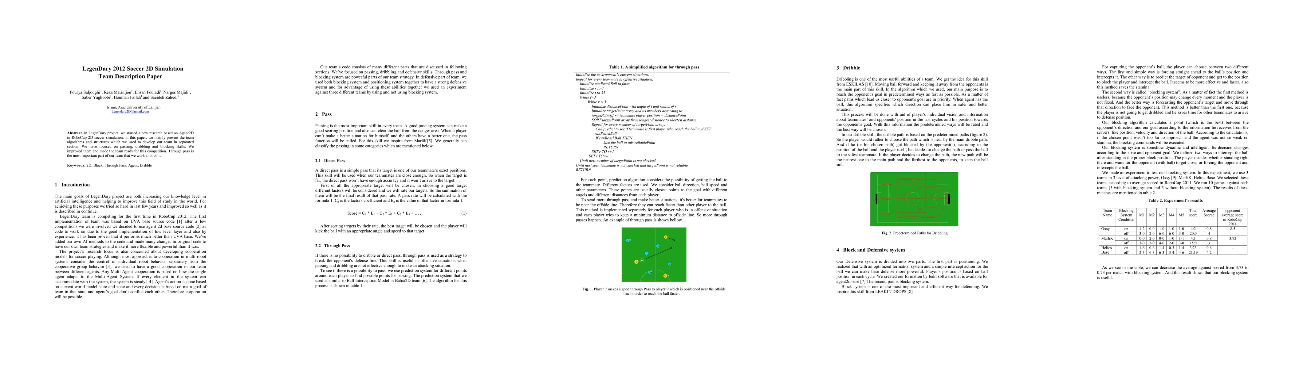In LegenDary project, we started a new research based on Agent2D in RoboCup 2D soccer simulation. In this paper, we mainly present the team algorithms and structures which we used to develop our team in separated section. We have focused on passing, dribbling and blocking skills. We improved them and made the team ready for this competition. Through pass is the most important part of our team that we work a lot on it.