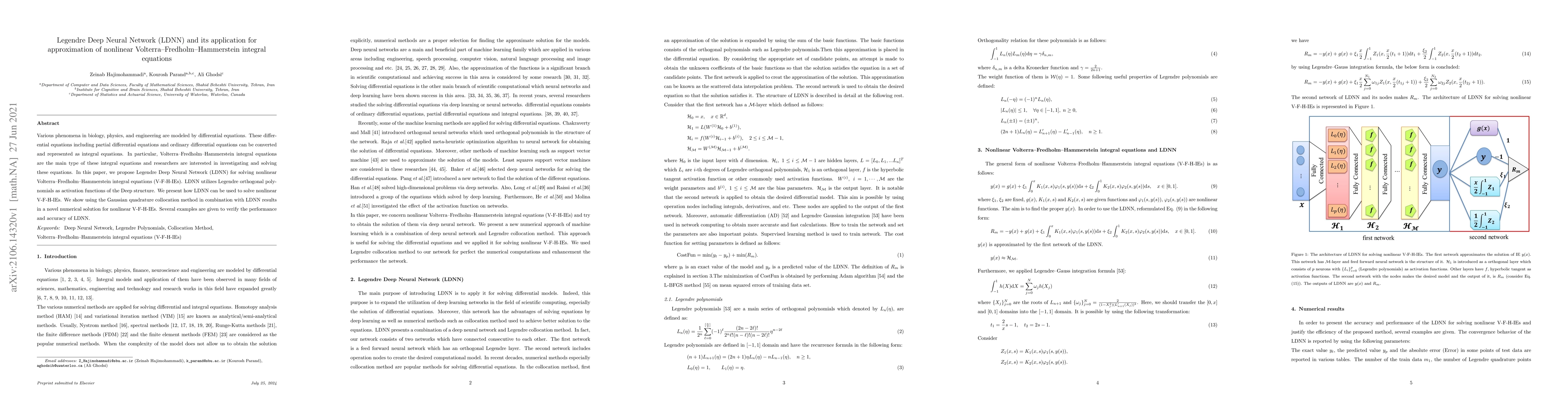 This paper proposes a Legendre Deep Neural Network (LDNN) for solving nonlinear Volterra Fredholm Hammerstein integral equations (VFHIEs). LDNN employs Legendre polynomials for activation functions and combines it with the Gaussian quadrature collocation method for a novel numerical solution, demonstrating its performance through various examples.